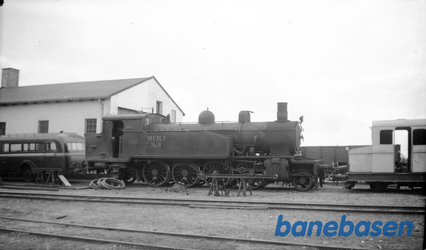 Motiv: | Damplokomotiv HFHJ nr 9 ved værkstedet i Frederiksværk. Uden kobbelstænger |