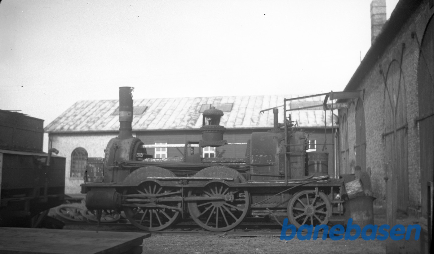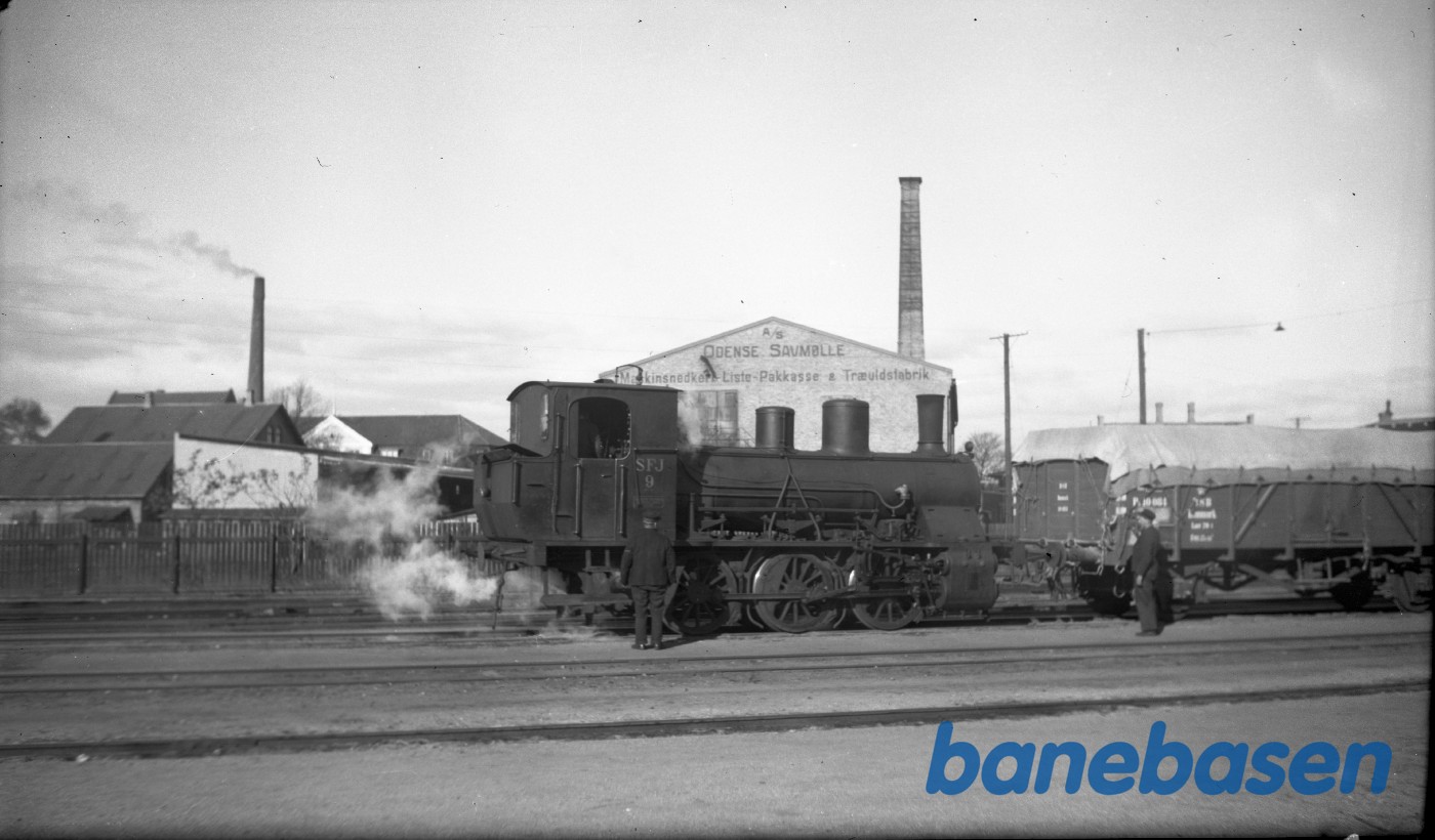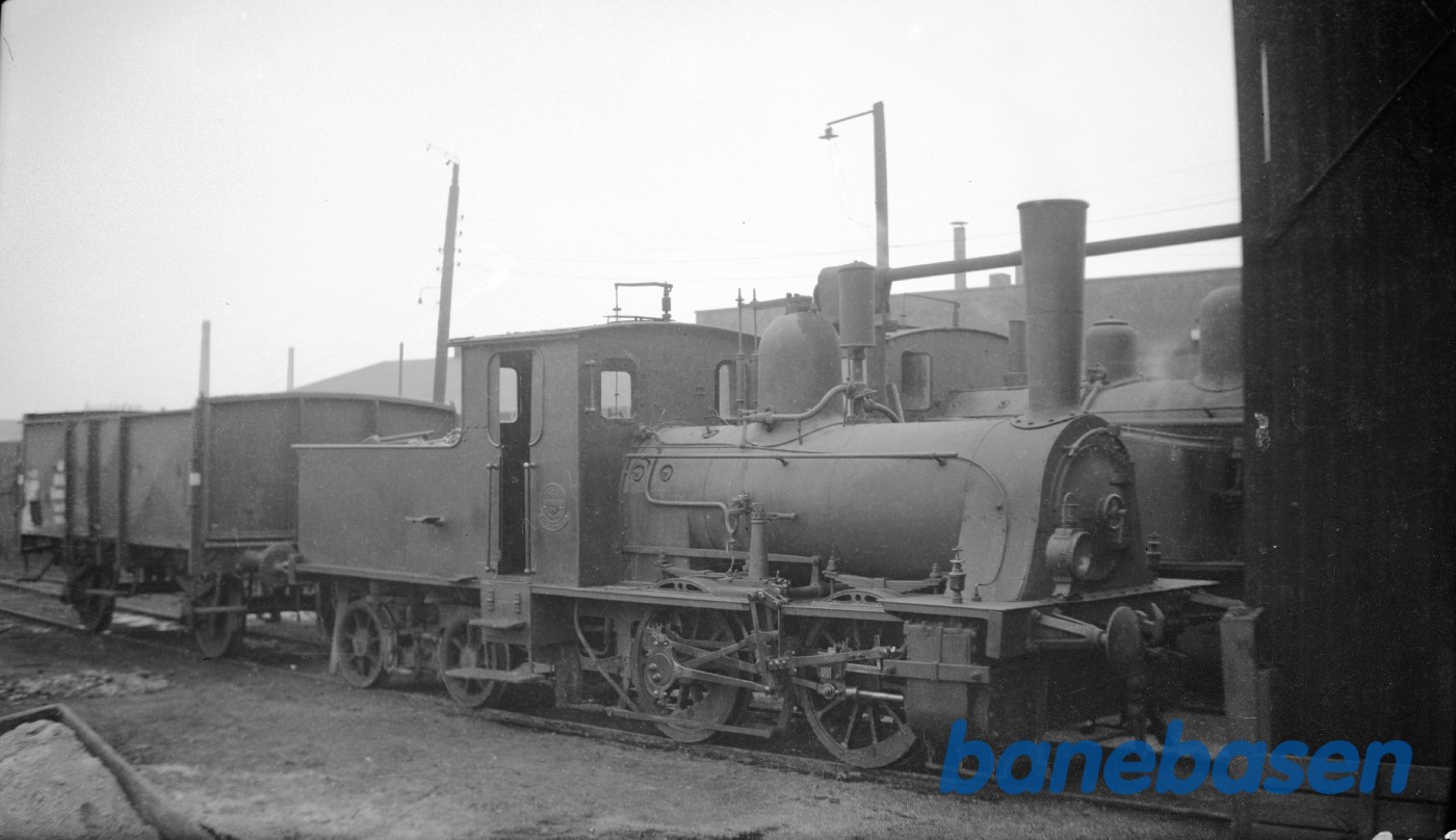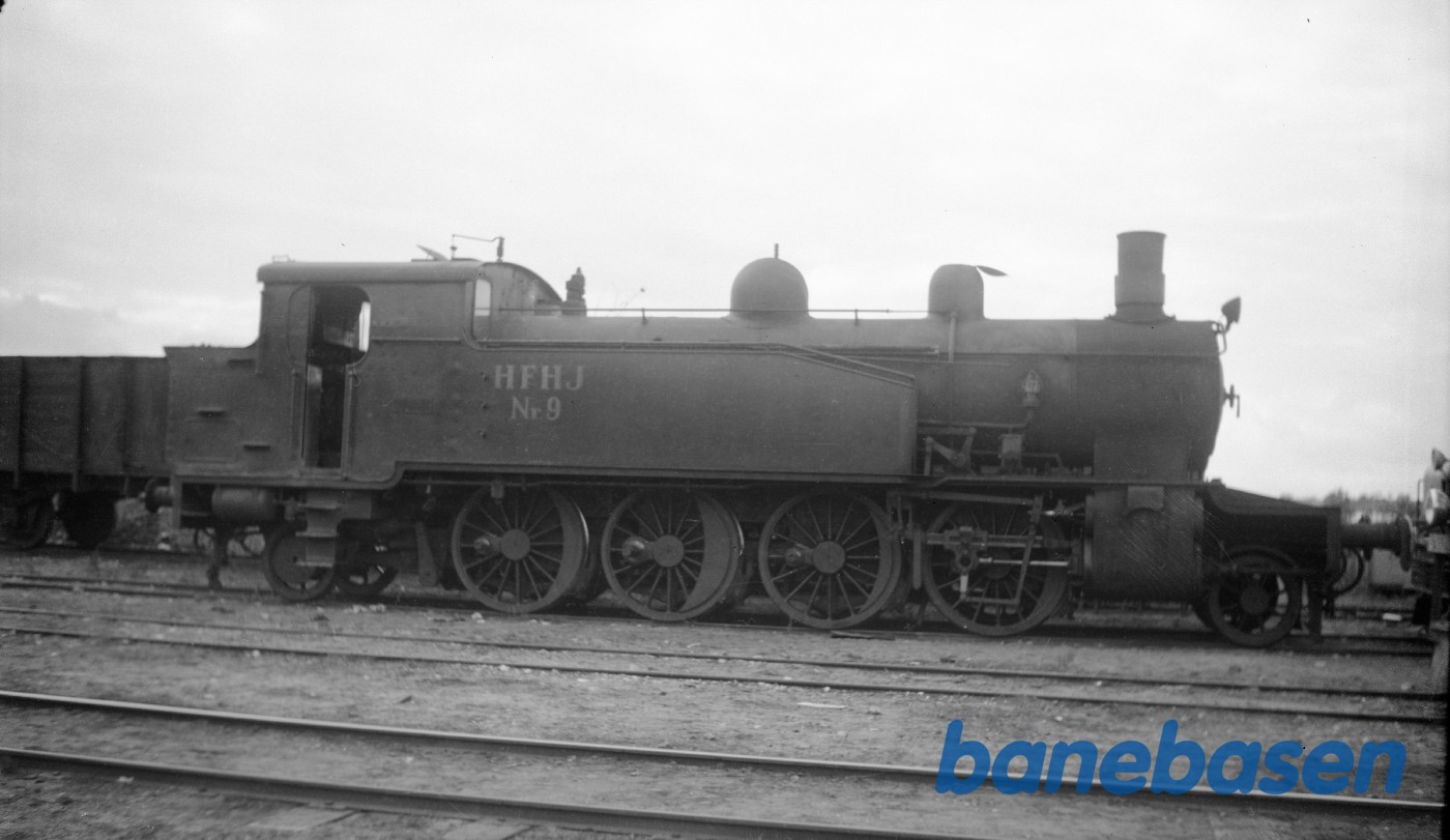 Motiv: | Damplokomotiv HFHJ nr. 9 ved værkstedet i Frederiksværk. Uden kobbelstænger |