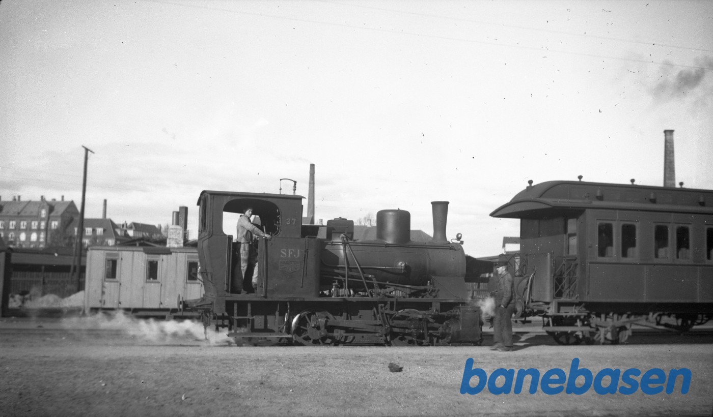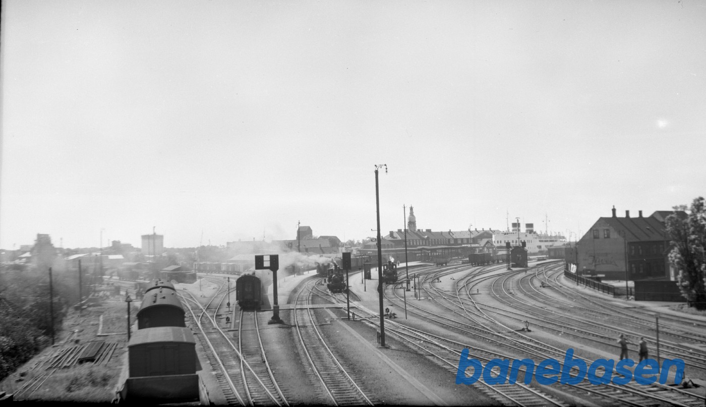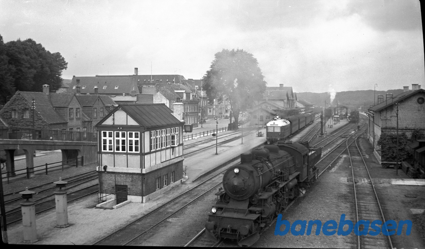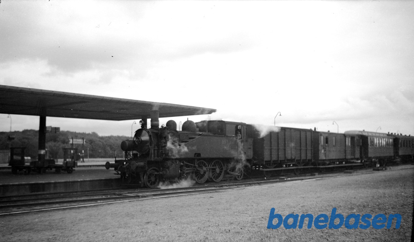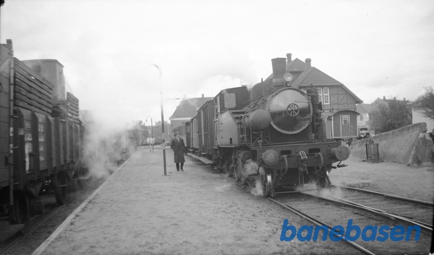 Motiv: | Damplokomotiv LJ 20 rangerer på Nakskov station. LJ skinnebusser venter ved perron |