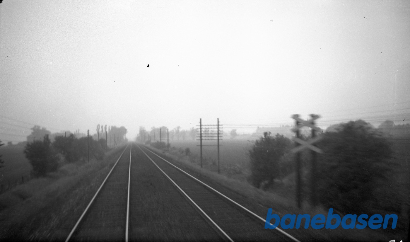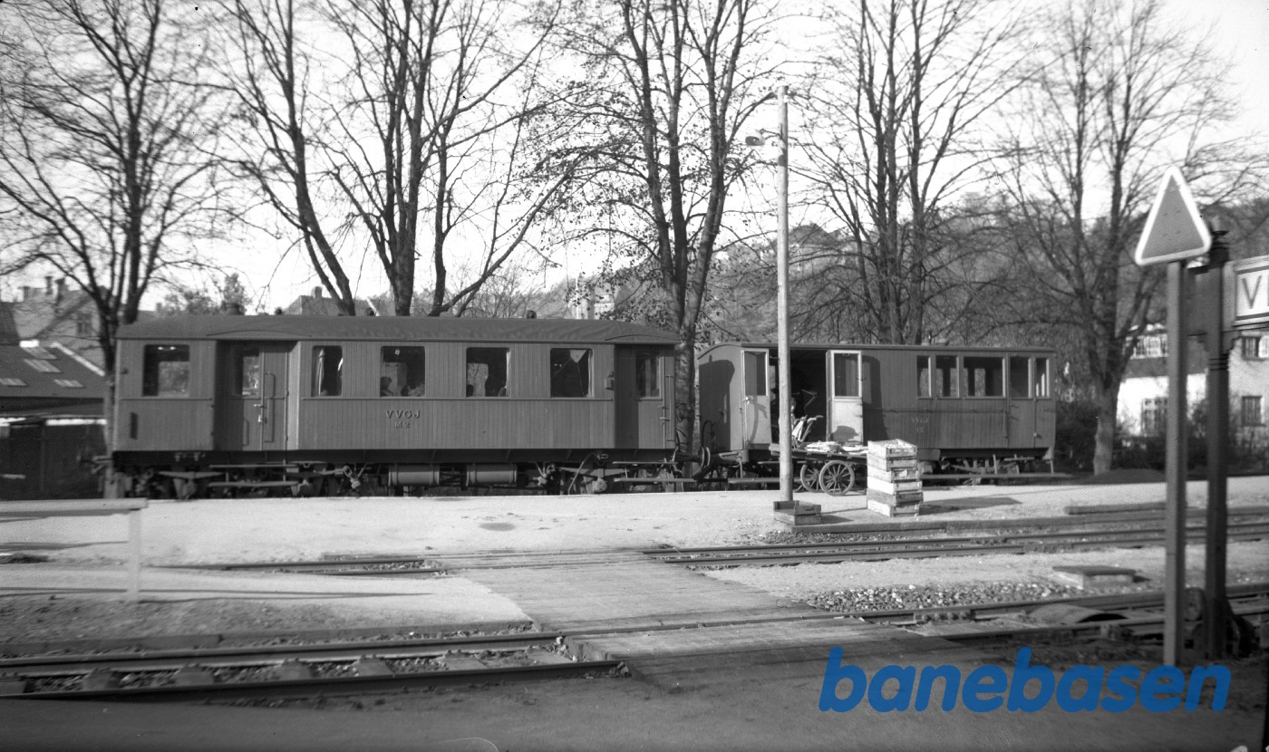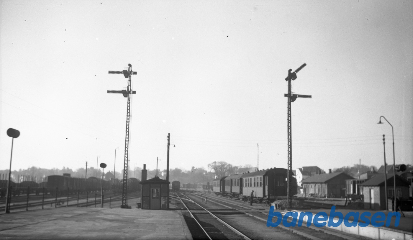 Motiv: | Motorlokomotiv LJ M 31 med dobbeltvogn klar til afgang fra Nykøbing F station mod Nakskov. På Nystedperronen holder en Triangelmotorvogn, som skal til Nysted |