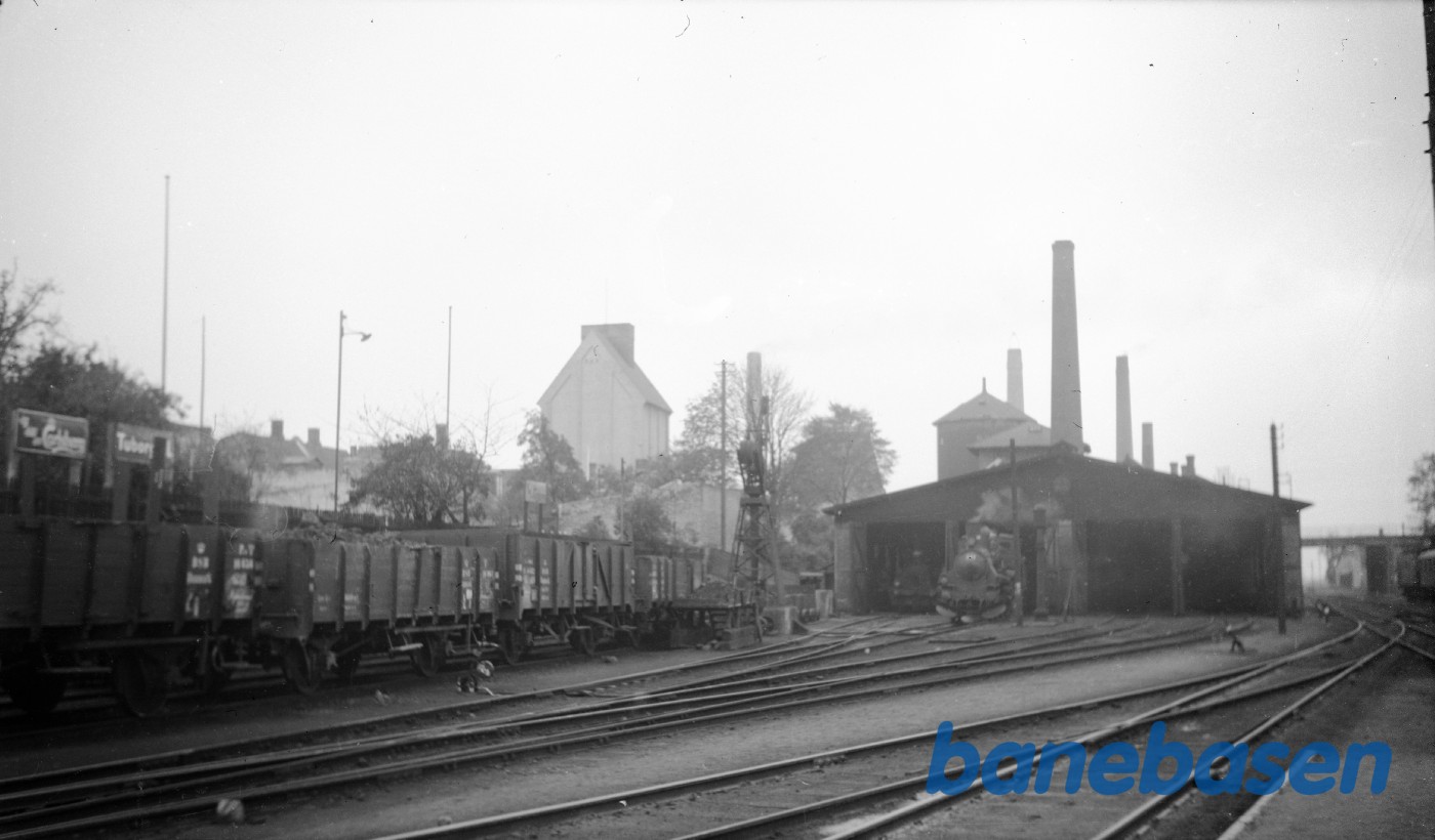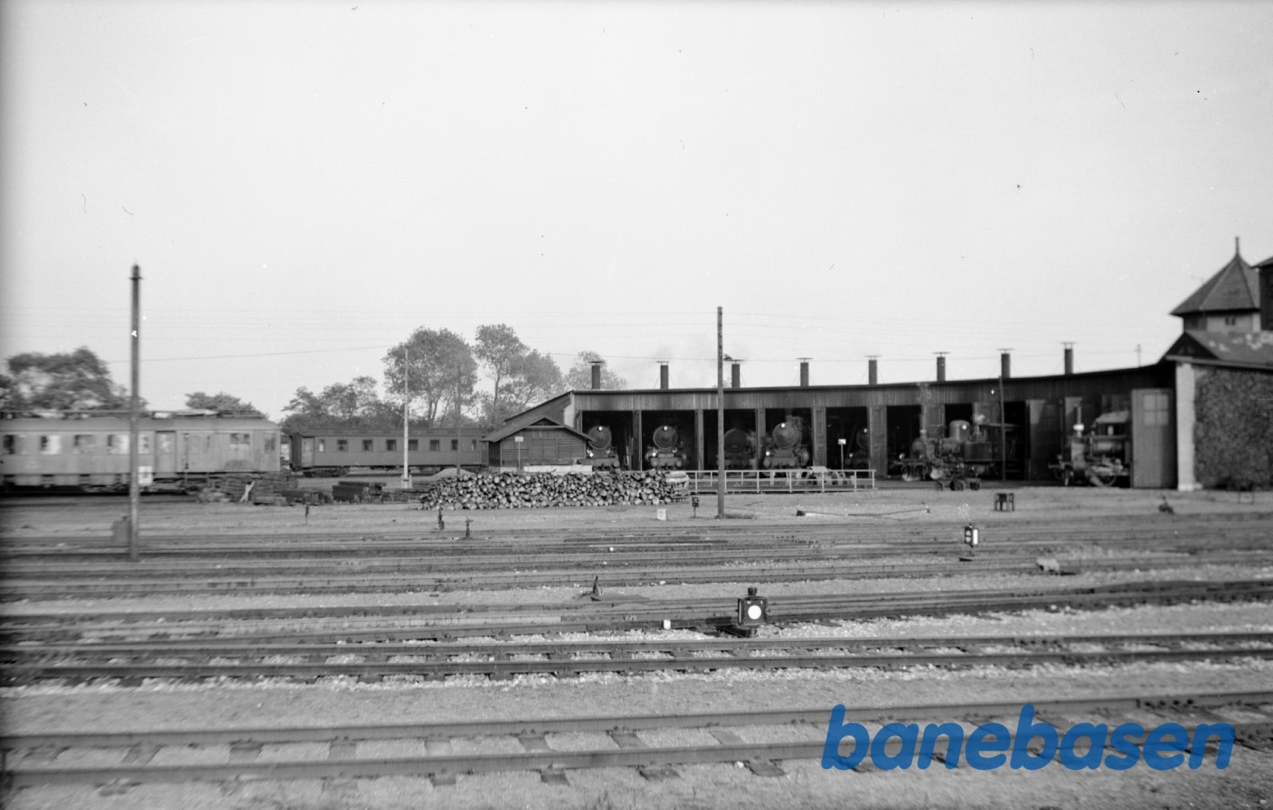 Motiv: | Remisen i Gedser med 7 damplokomotiver i portene |