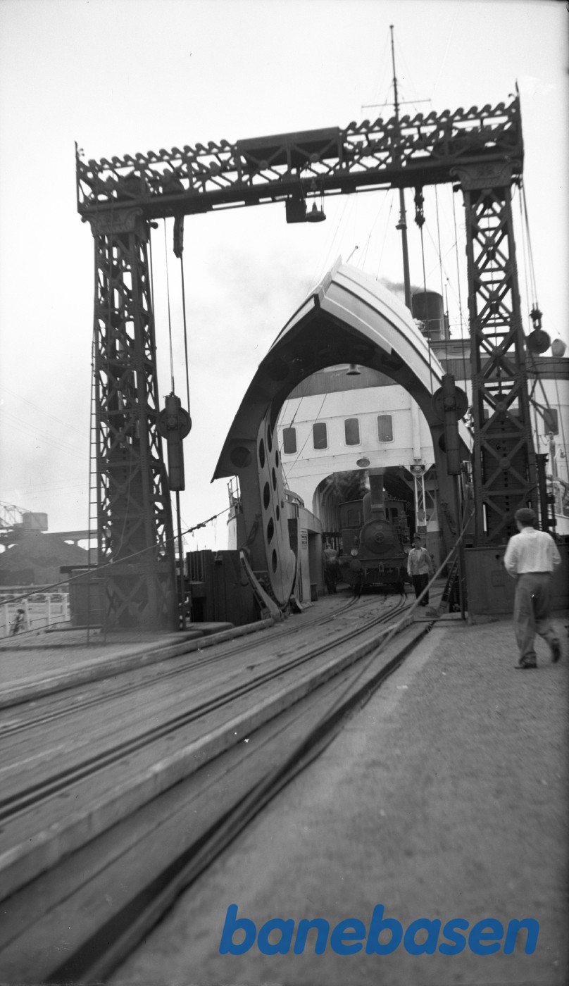 Motiv: | Damplokomotiv Ltr F rangerer på færgen Danmark i Gedser |