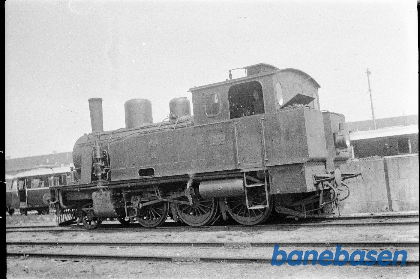 Motiv: | Damplokomotiv F 61 holder i remisen i Horsens |