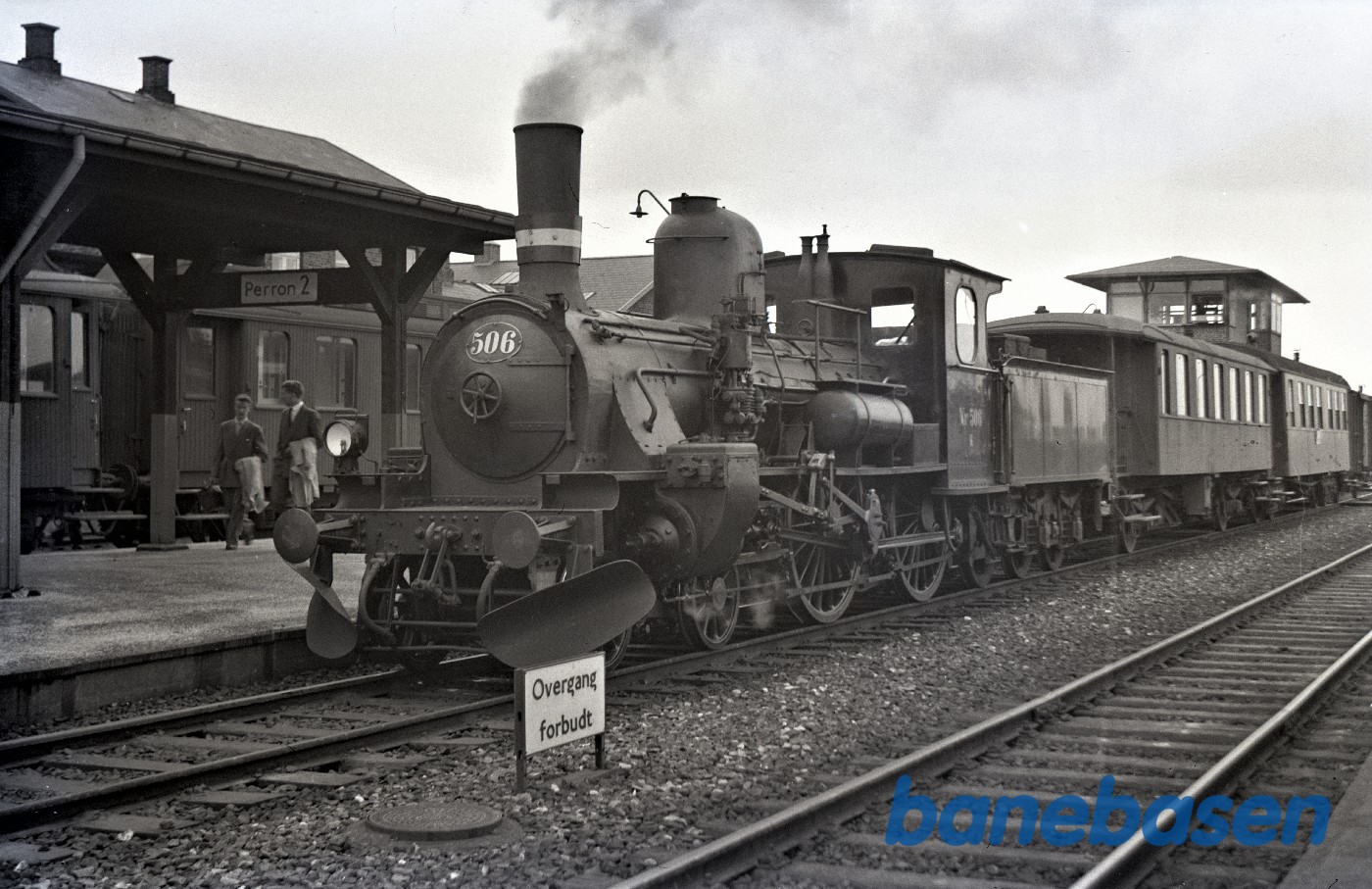 Damplokomotiv K 506 med persontog fra Grindsted holder på Bramming station spor 3