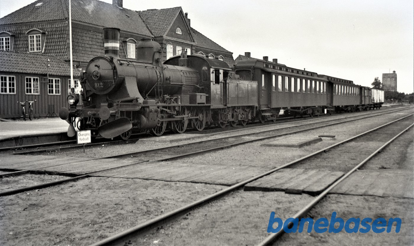 Motiv:Damplokomotiv D 812 med blandet tog holder på Grindsted station
