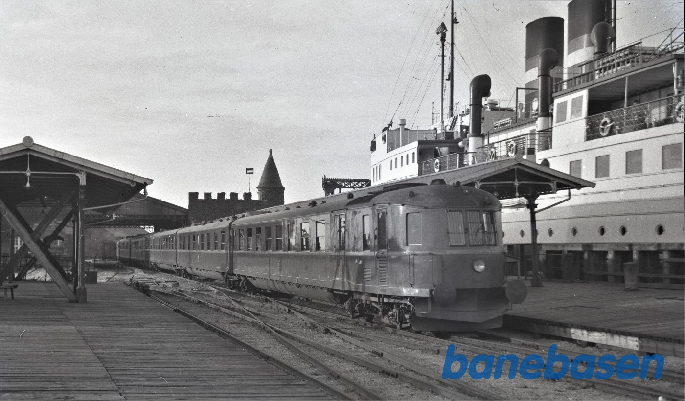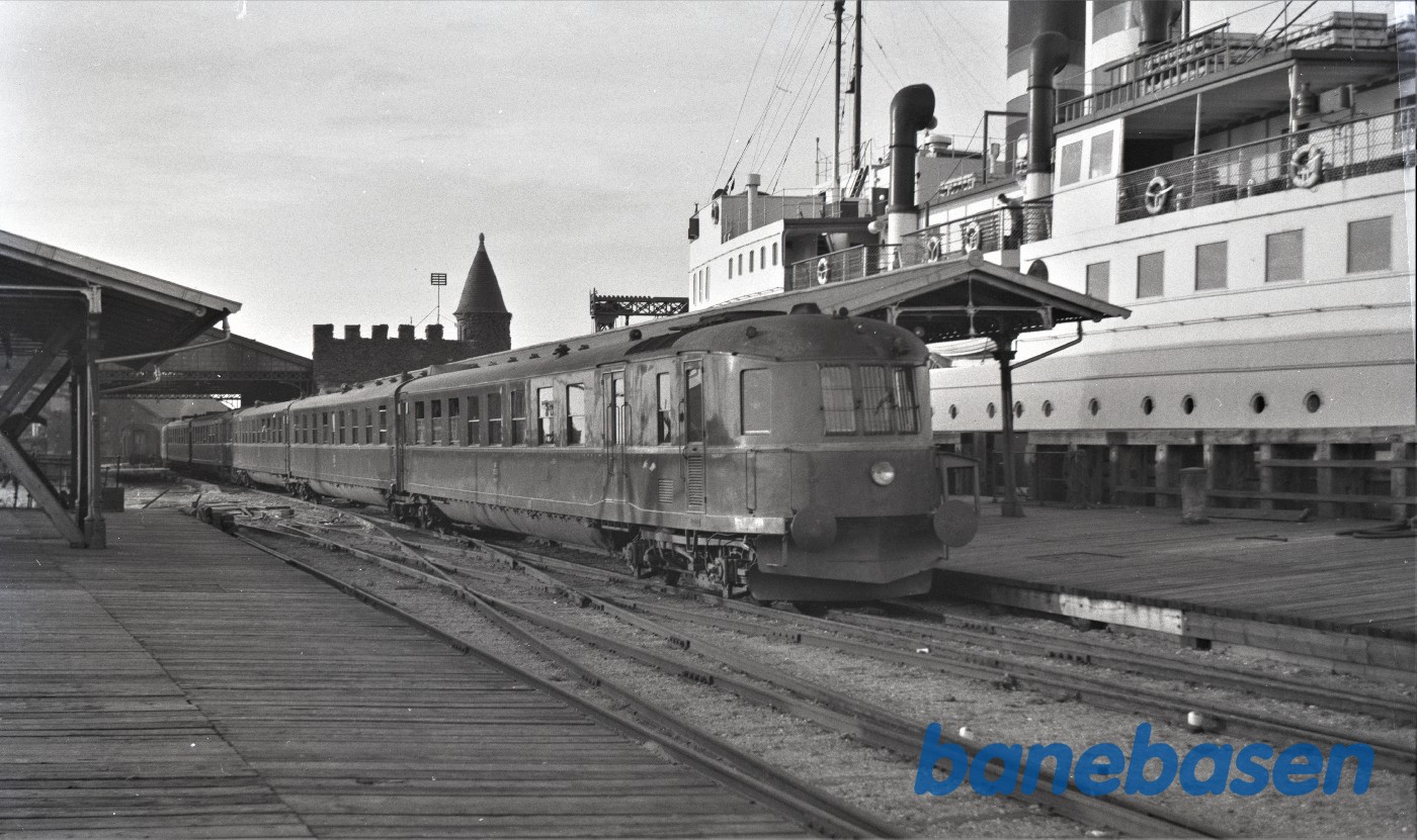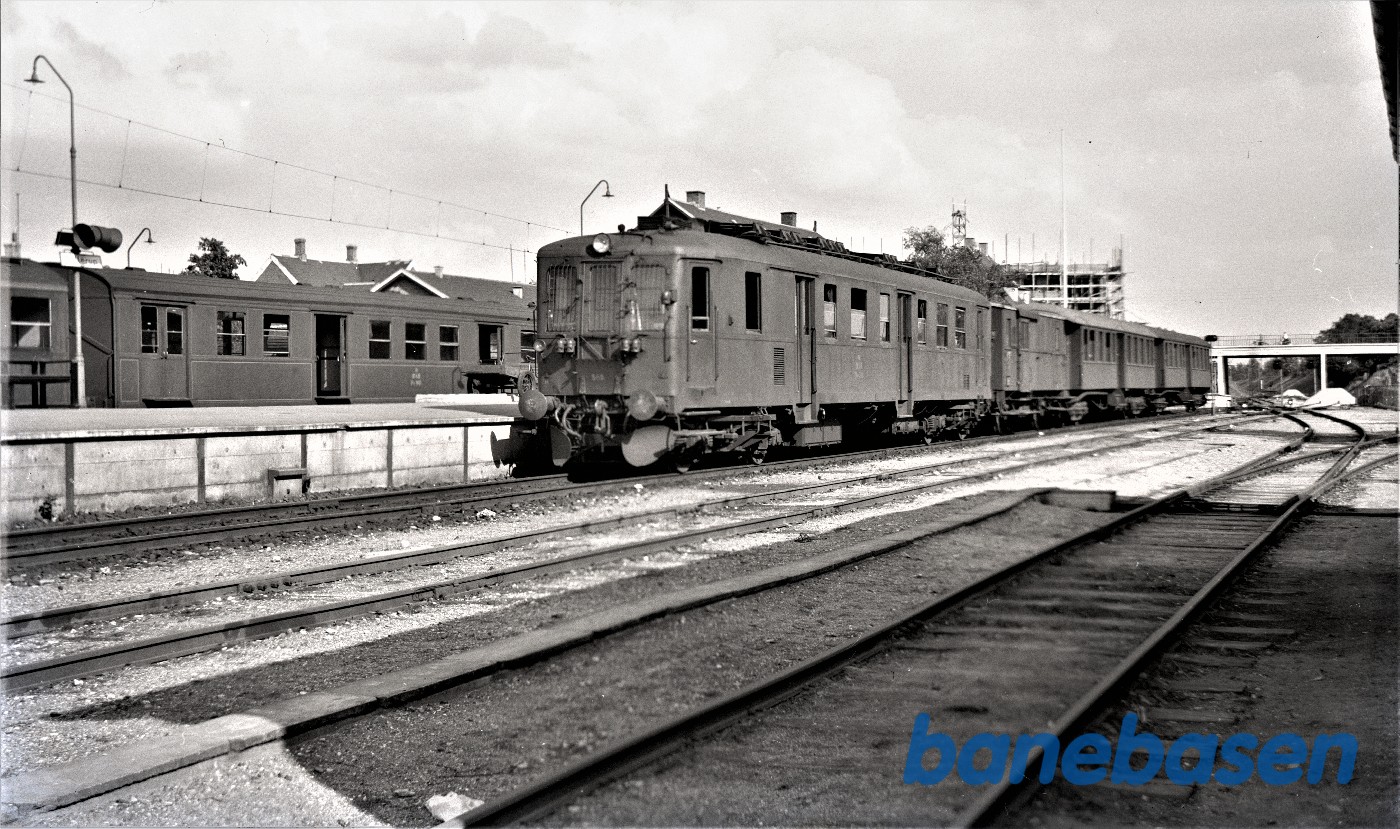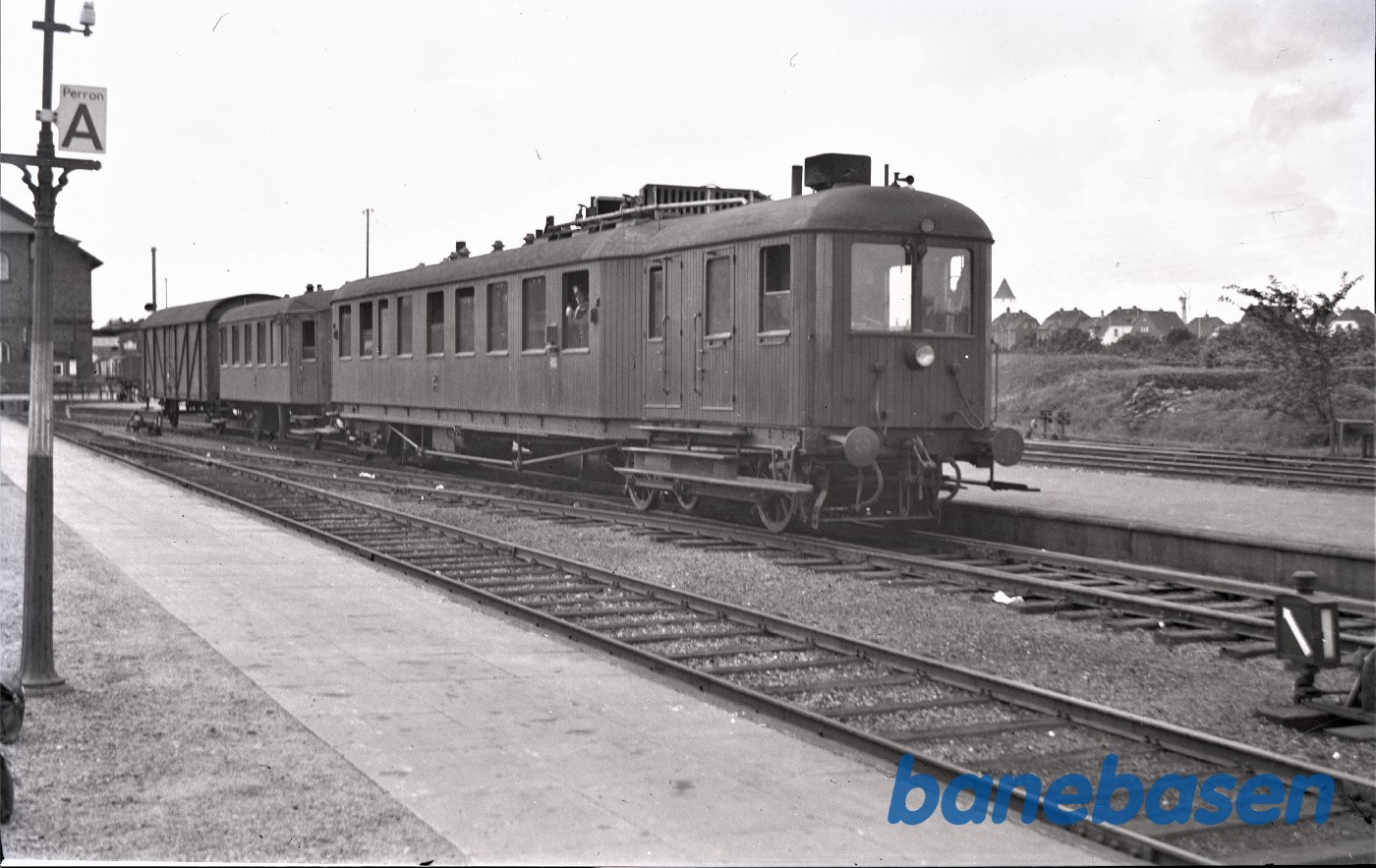 Motiv:Blandet tog fremført af SB motorvogn M1 holder ved perron i Federikshavn.