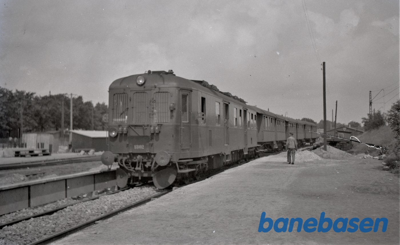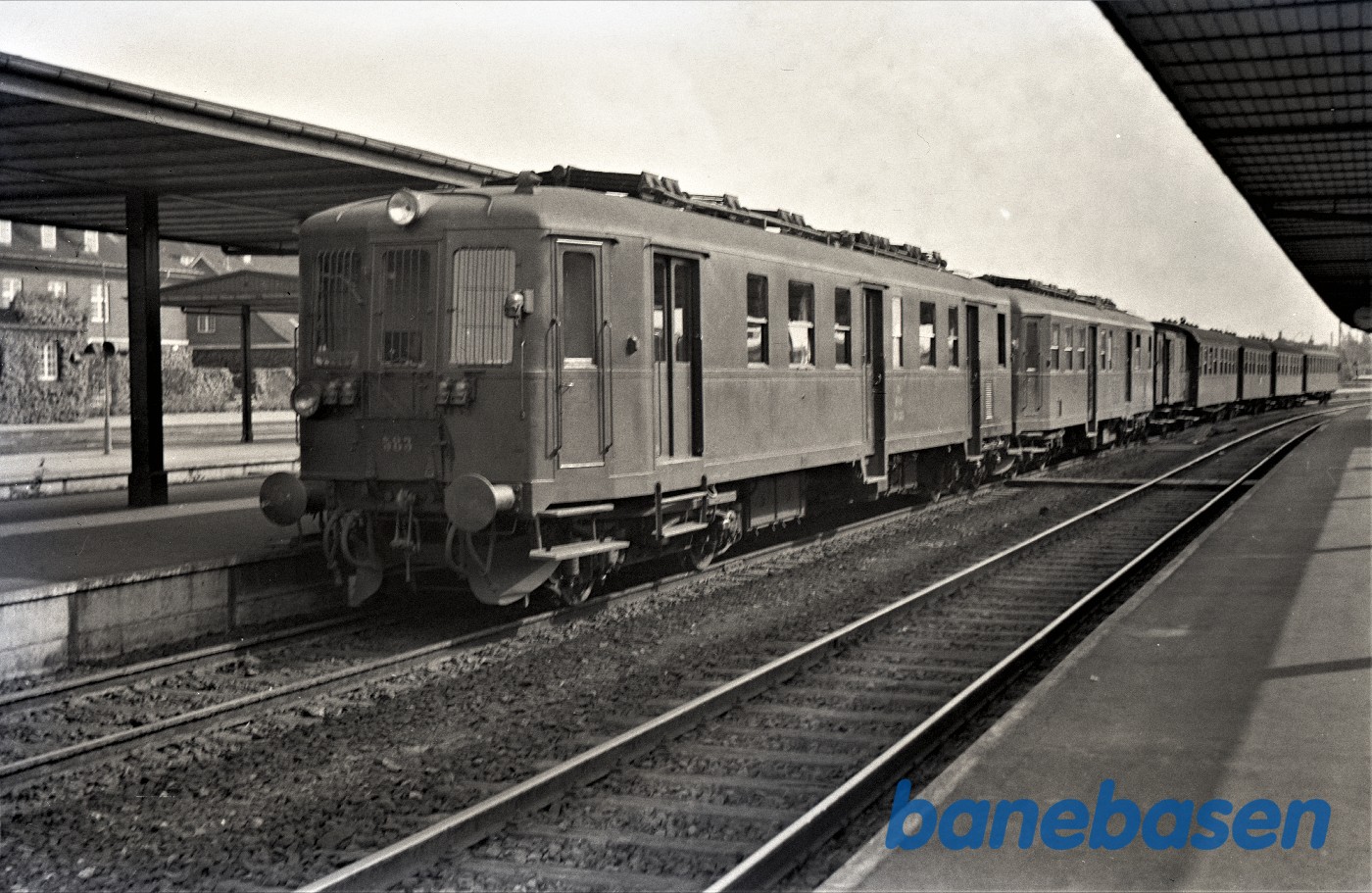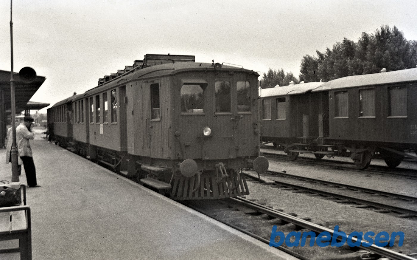 Motiv:Blandet tog fremført af SB motorvogn M1 holder ved perron i Federikshavn.