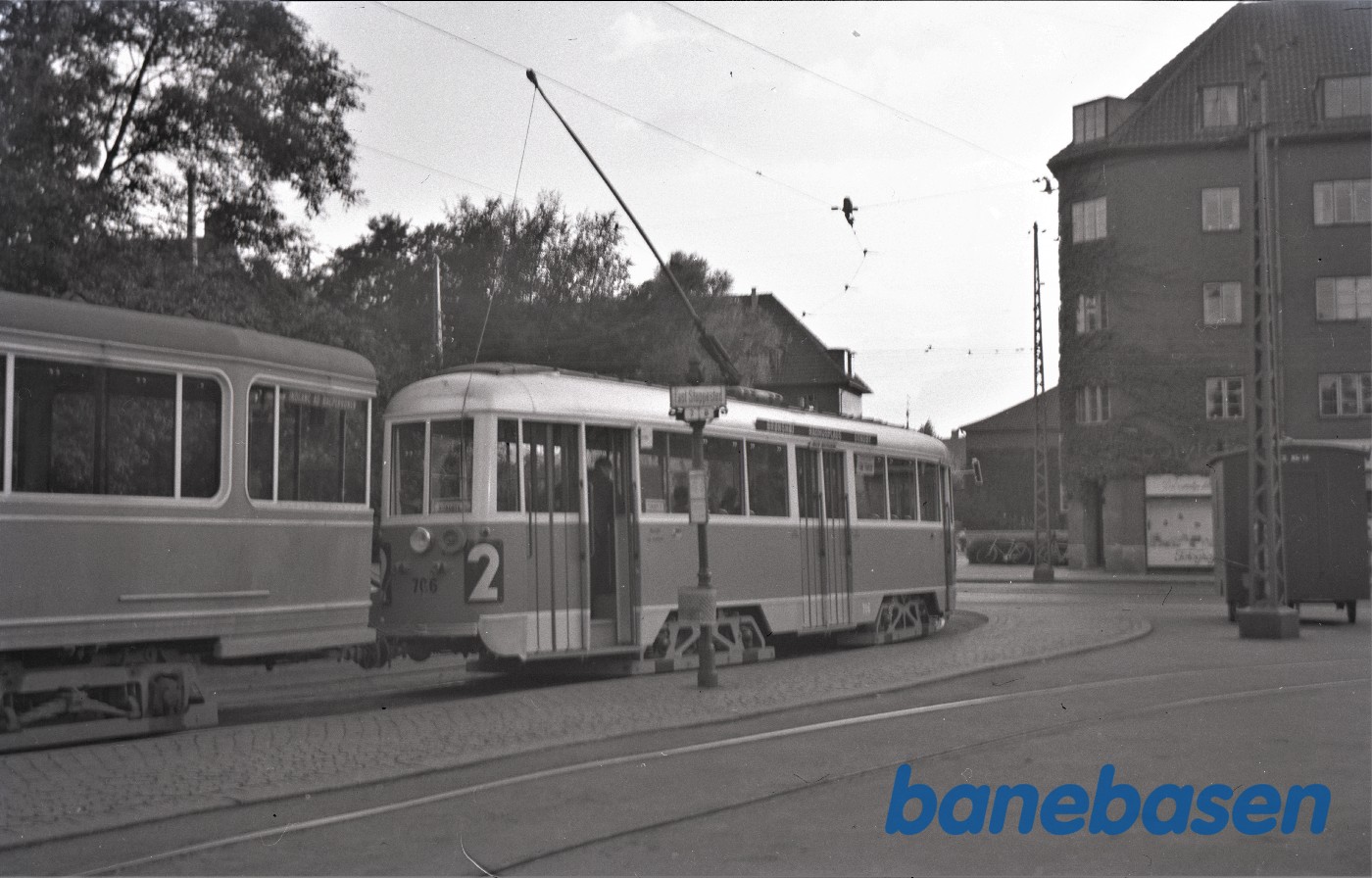 Sporvognstog med vogn 706 "Dukke Lise" holder i Brønshøj
