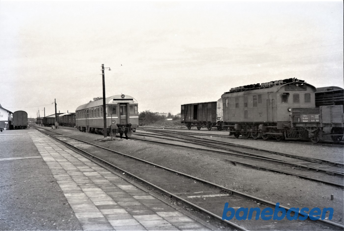 Blandet tog fremført af SB motorvogn M3 holder ved perron i Frederikshavn.
