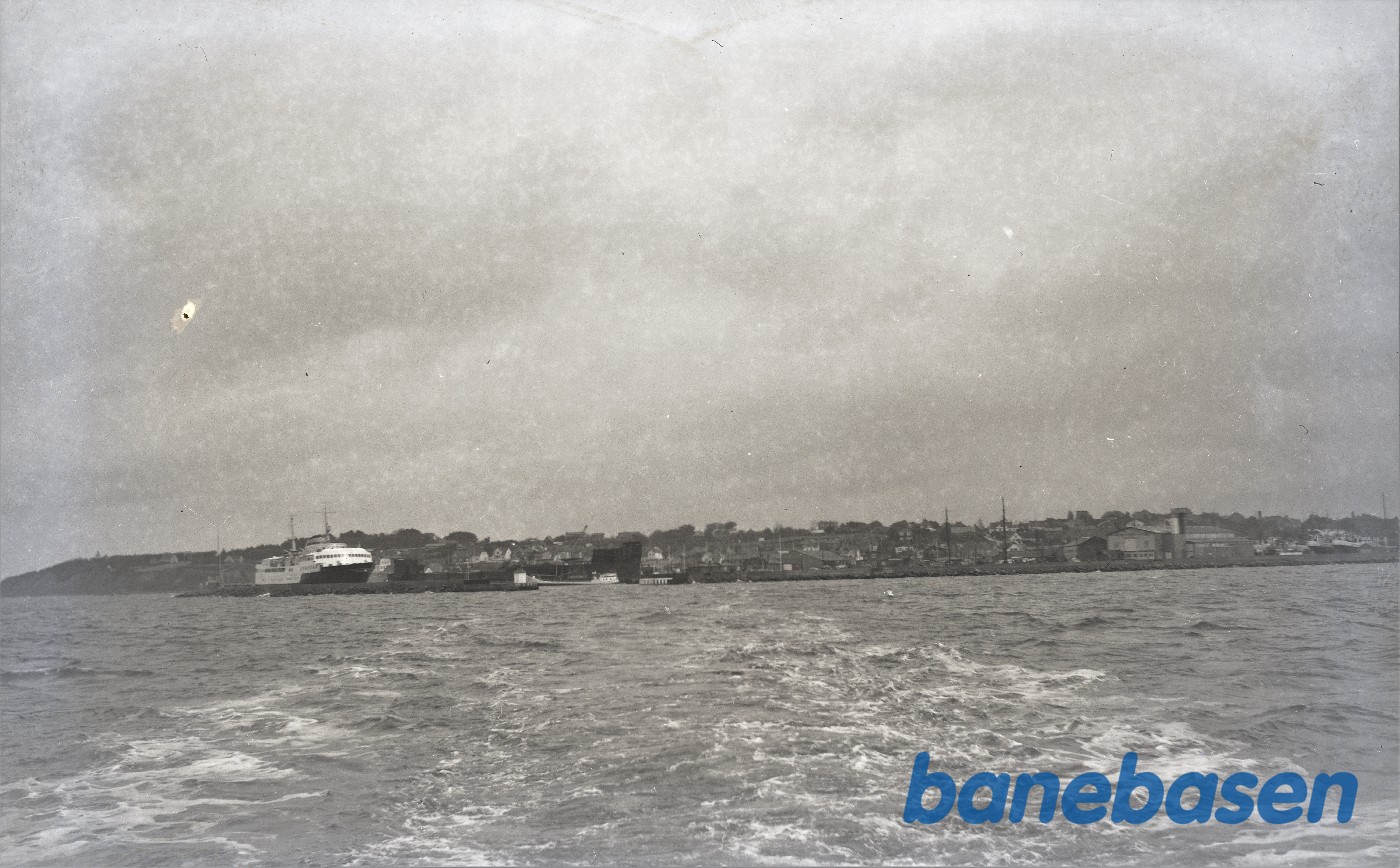 Motiv:Udsigt til Hundested havn fra Rørvig færgen. Færge til Grenå ligger i Havnen