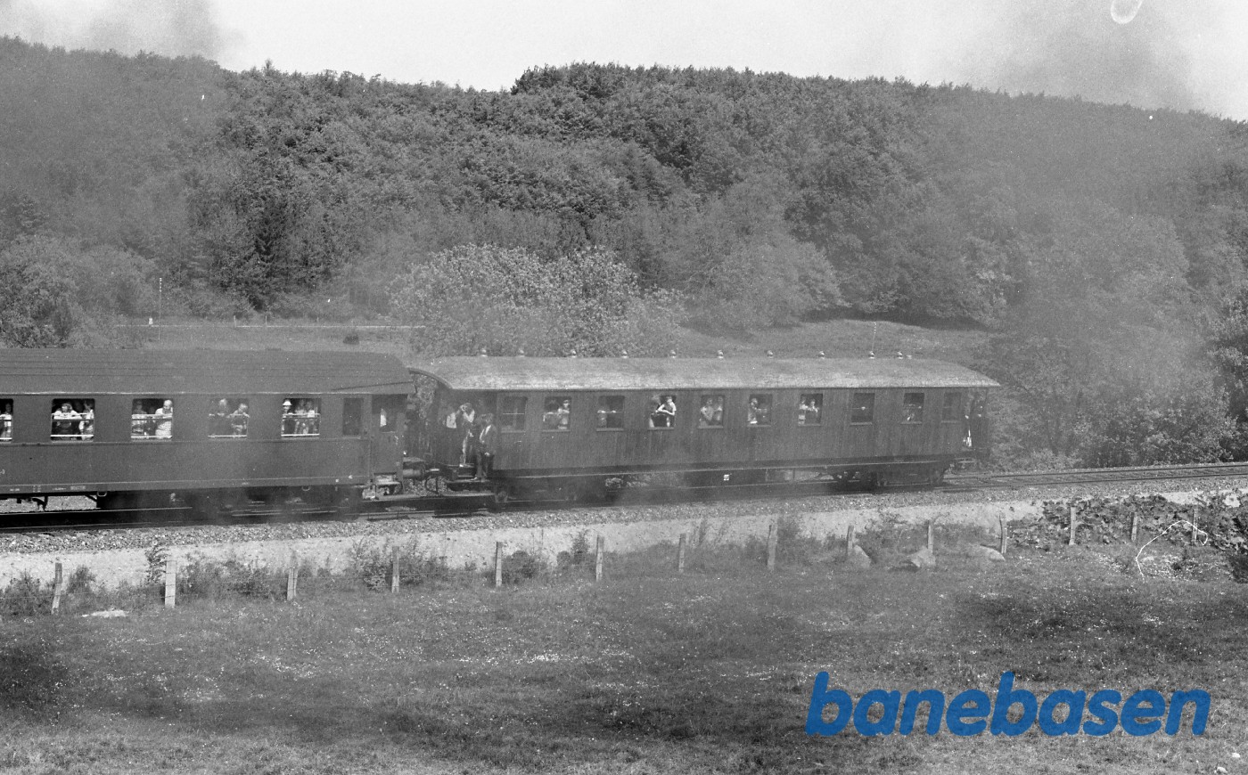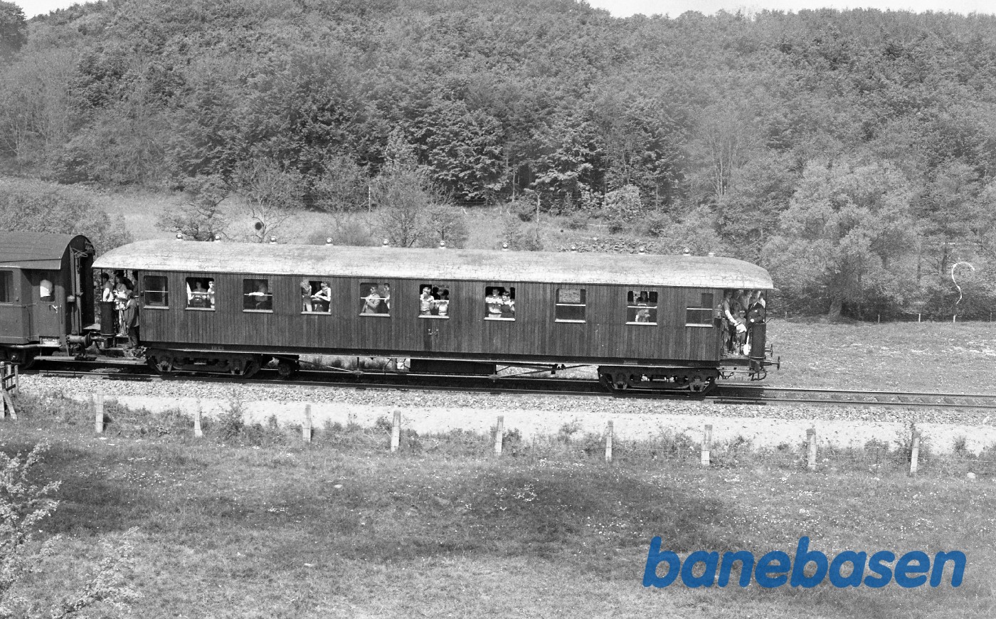 Motiv: | Iltog fra Holbæk mellem Lejre og Roskilde. Fem personvogne - den bagerste en spidsgavlet CM-vogn |