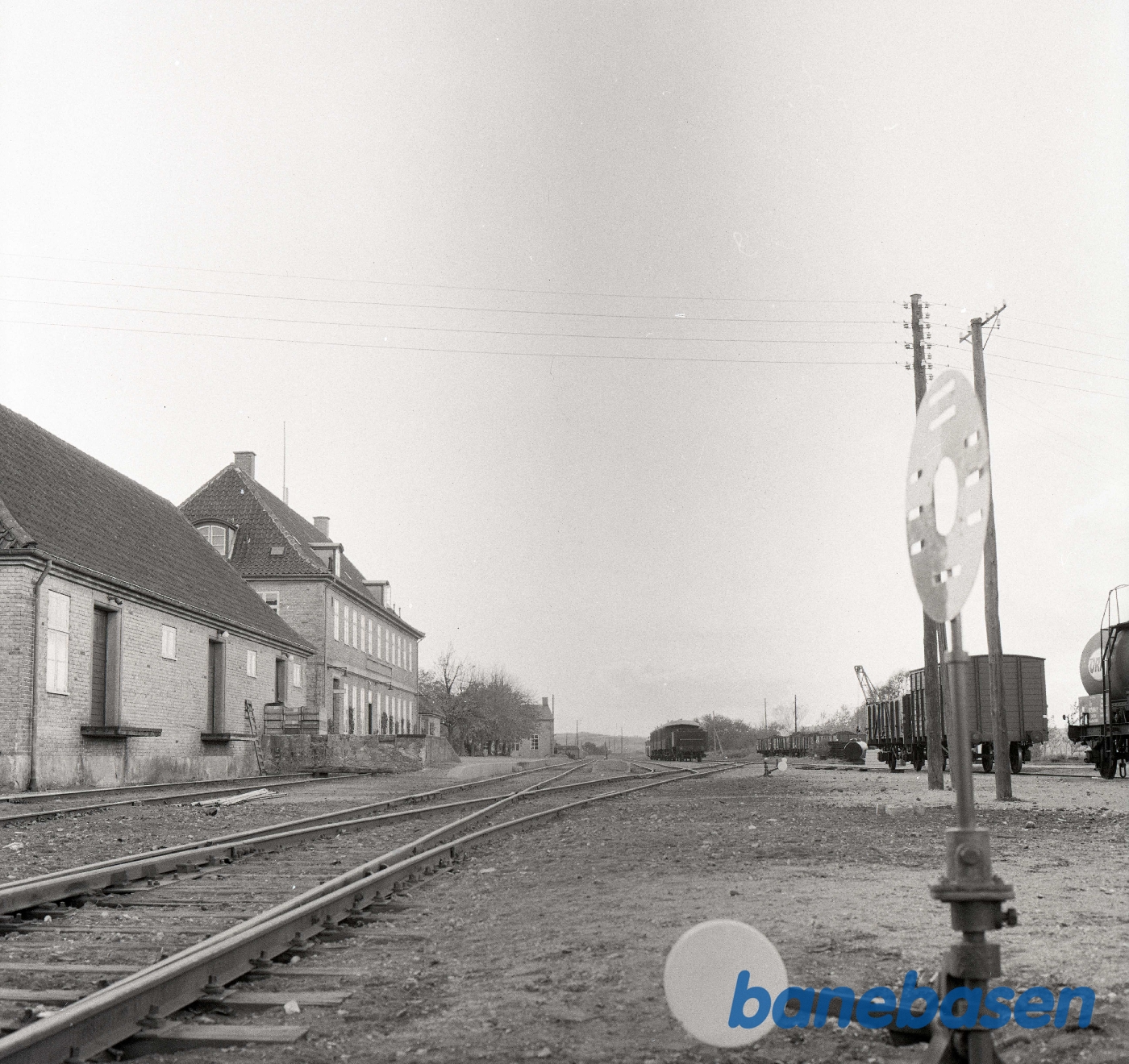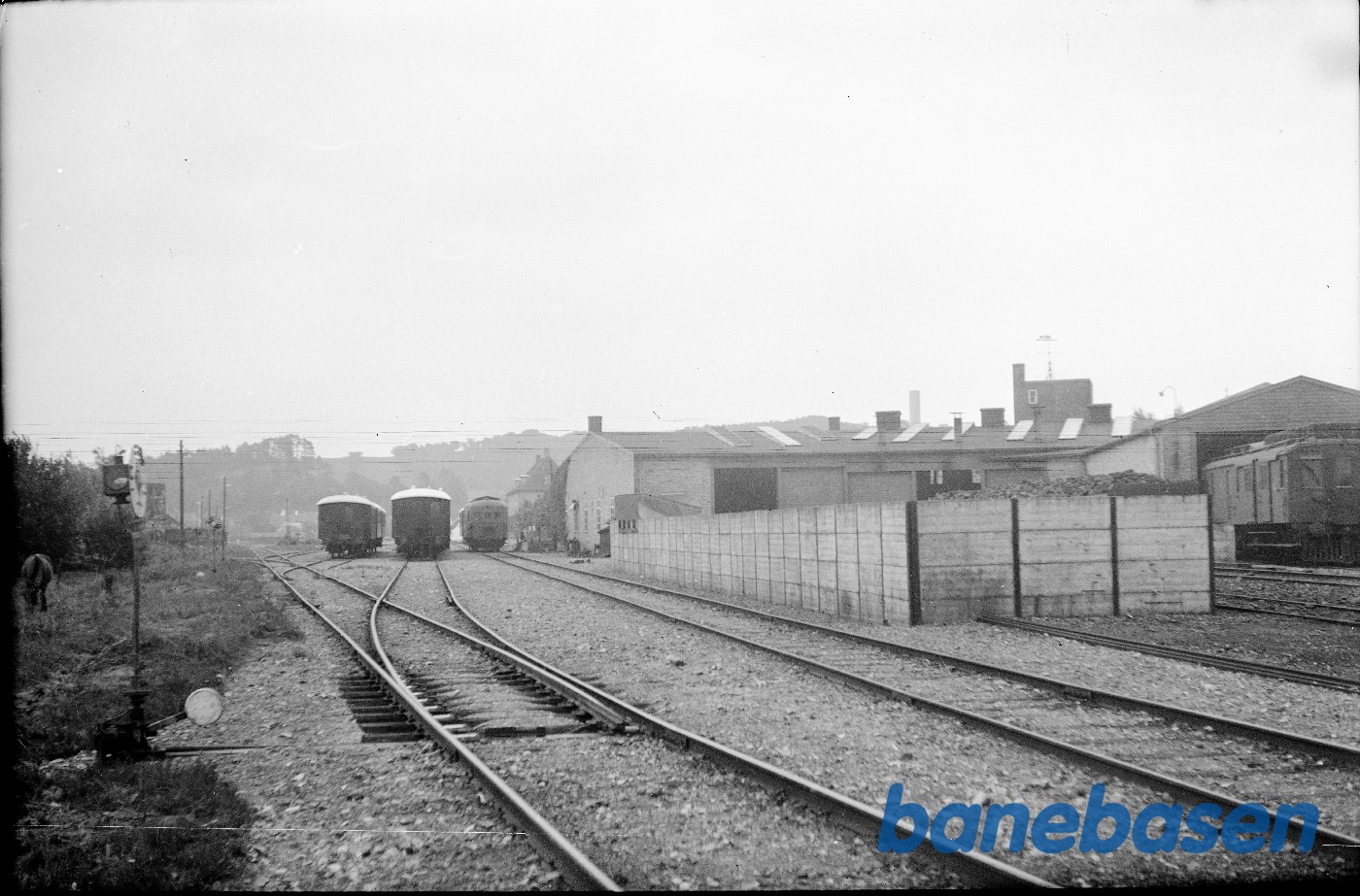Motiv: | Mariager station set fra jernbanen. Rullende materiel på sideporene |