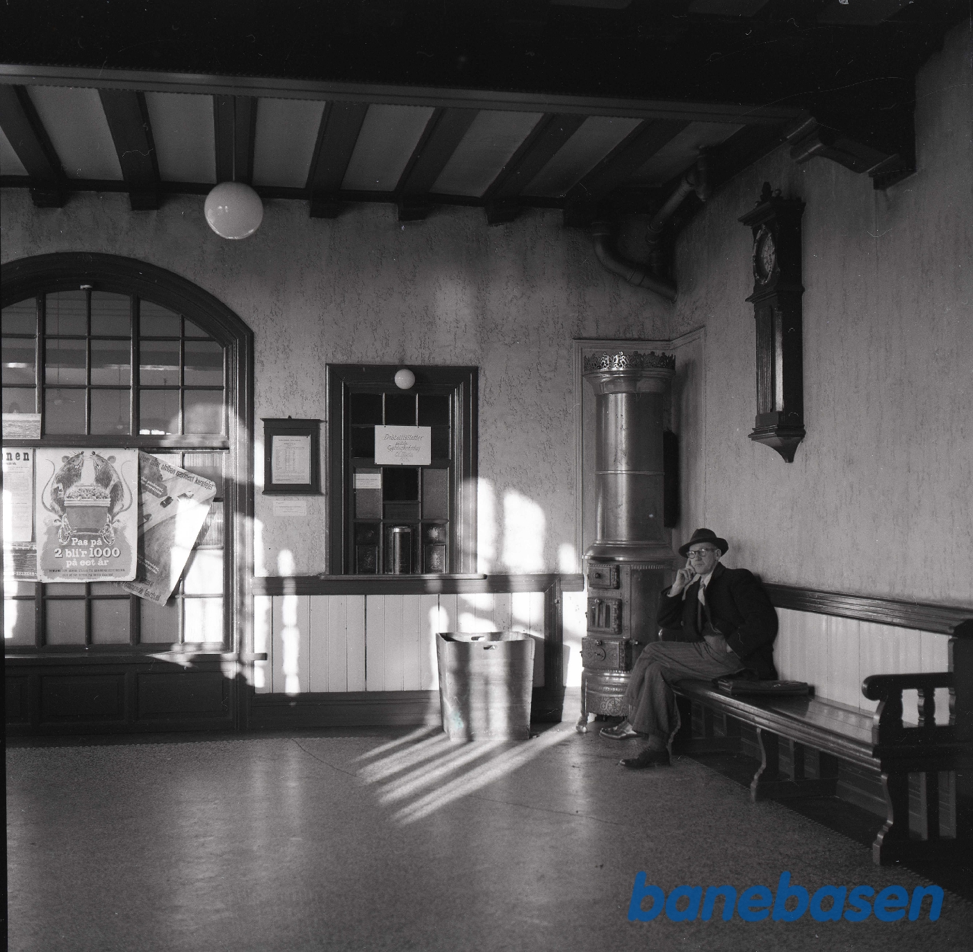 Motiv: | Hammelbanens station . Ventesalen med en rejsende. |