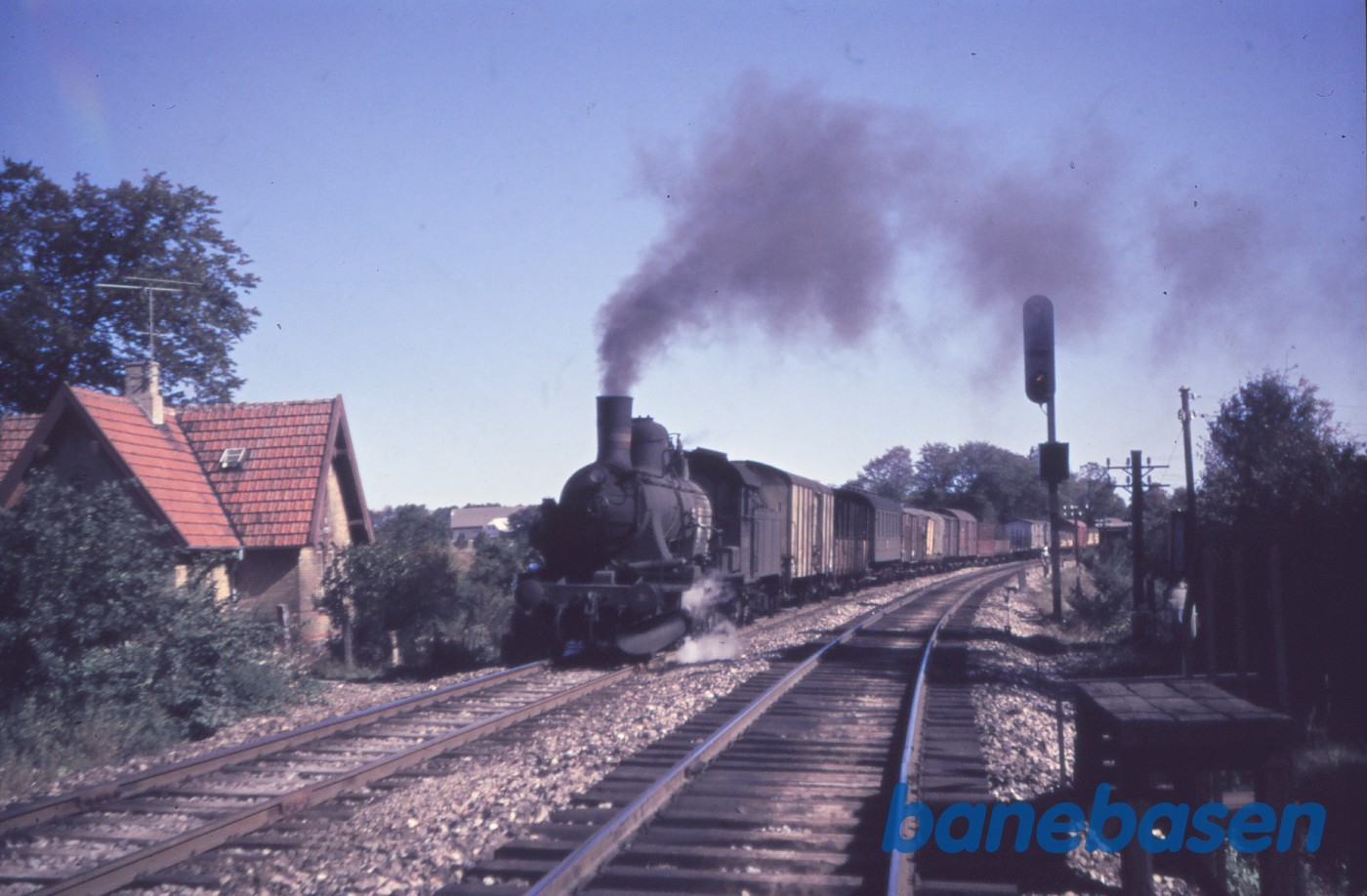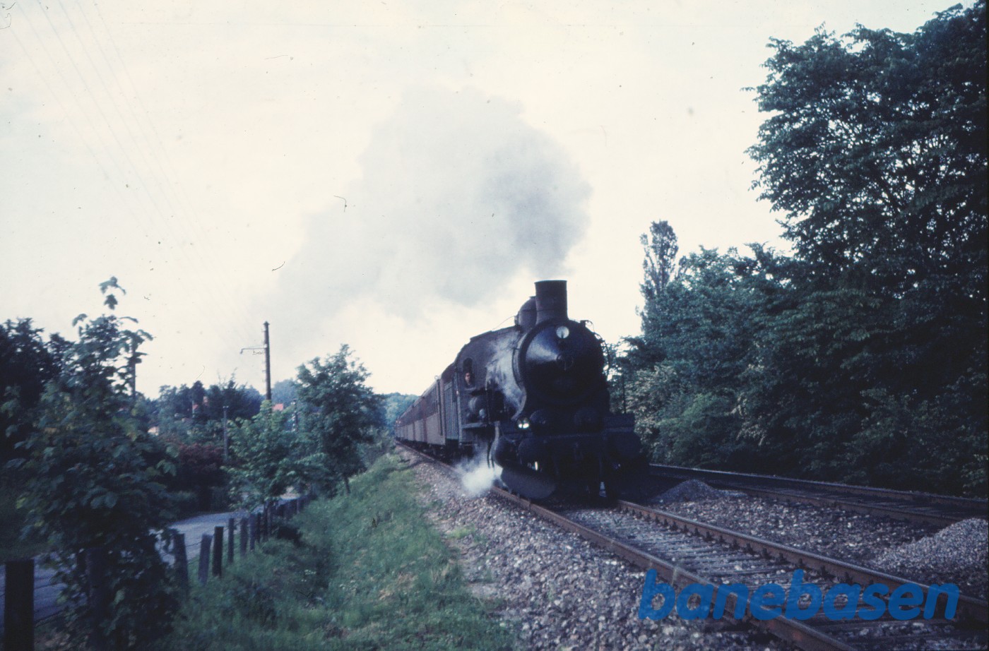 Motiv: | D 831 med godstog mellem Helsingør og Snekkersten, Bøgebakken skimtes til venstre, AM1441 til højre |