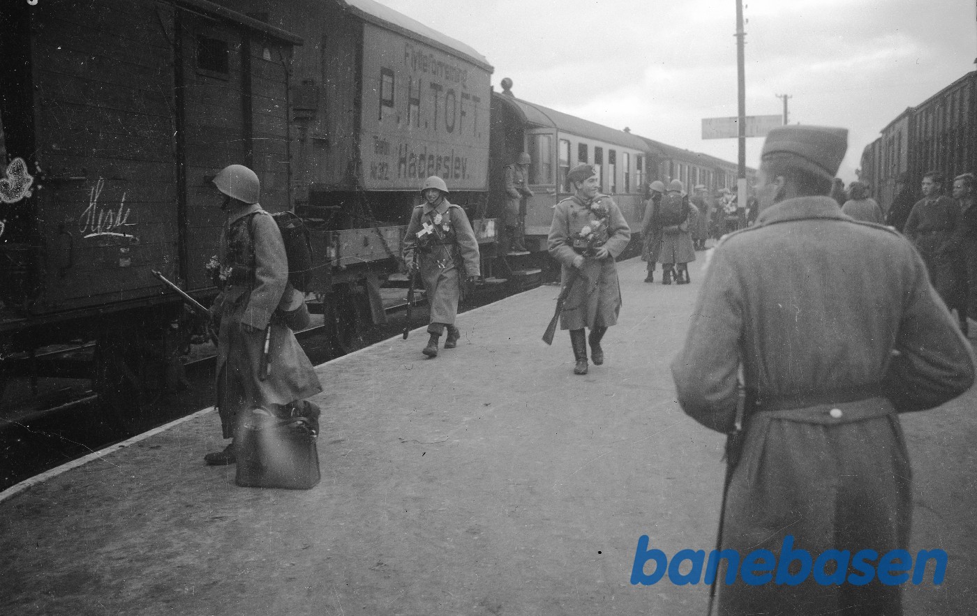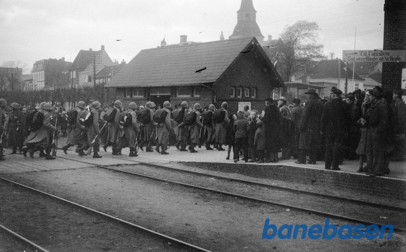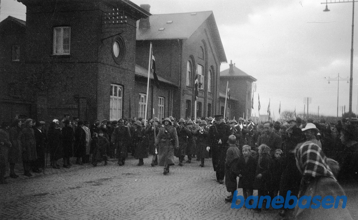 Motiv: | Militær-personel marcherer foran banegården |
