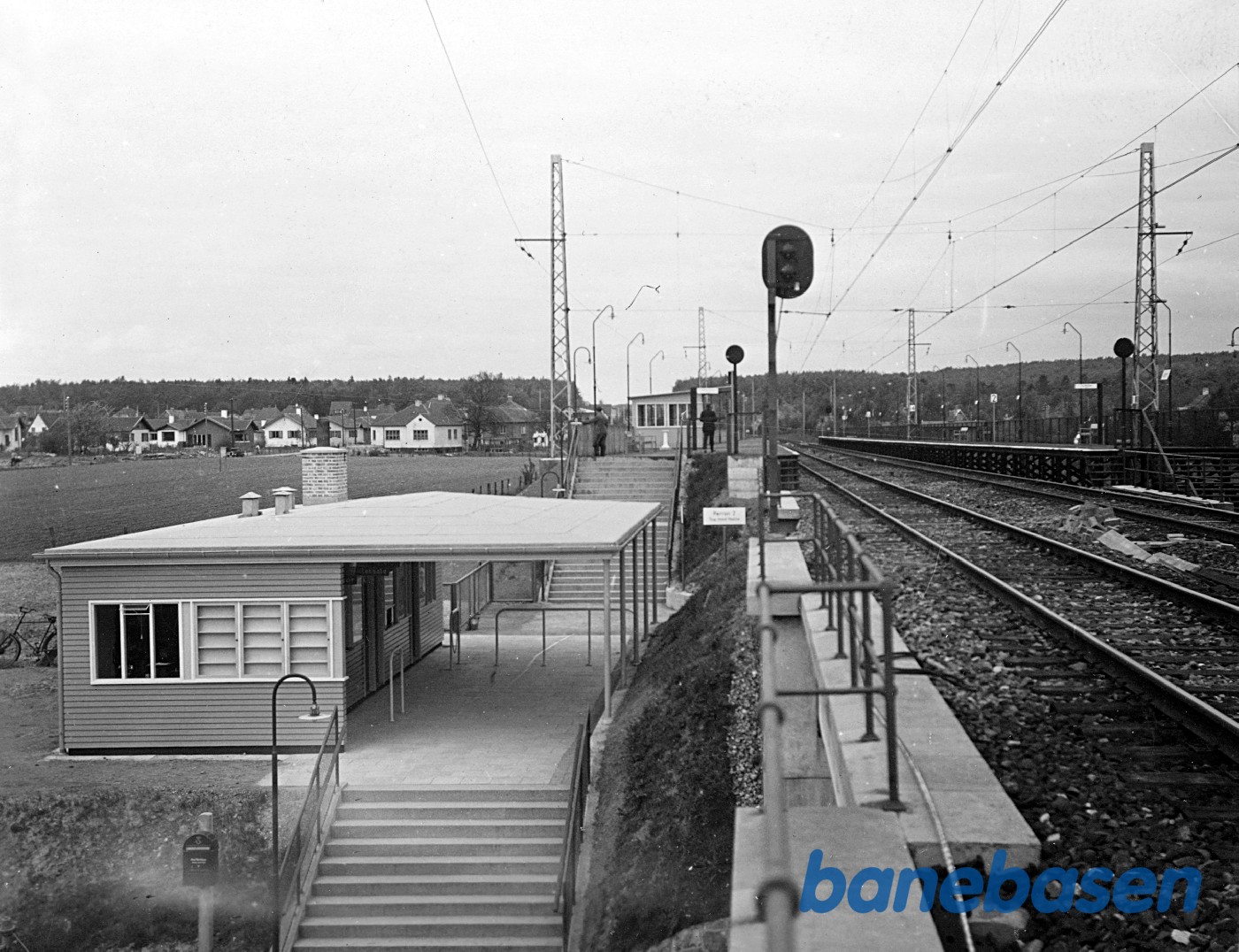 Motiv: | Den nyåbnede Virum station - en træbygning set fra broen over Frederiksdalsvej |
