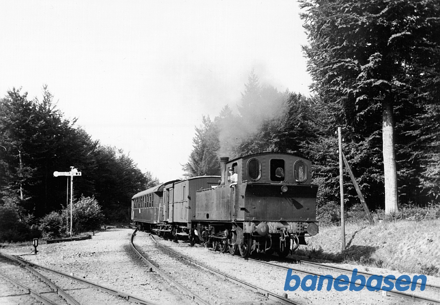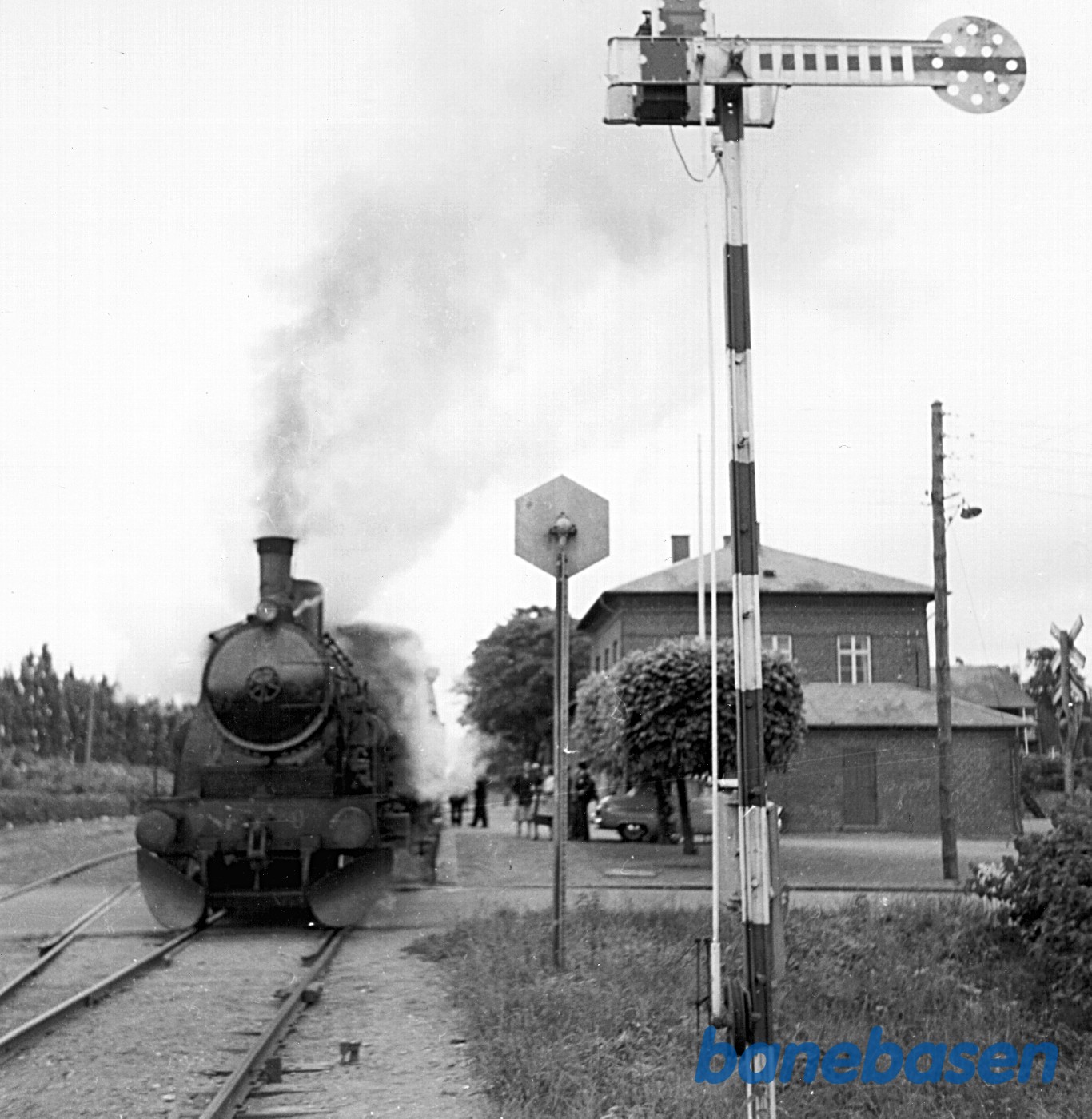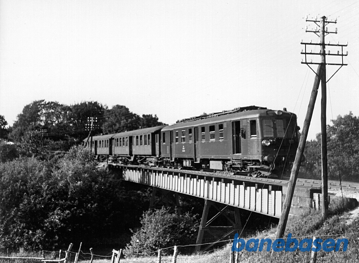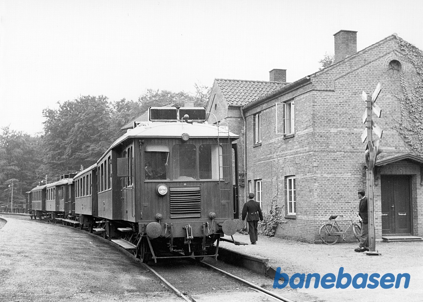 | Motiv: | Tog til Nakskov hvor første vogn er Aa3 (blev 1947 ombygget med lukkede endeperroner). Th. DSB E 982 |