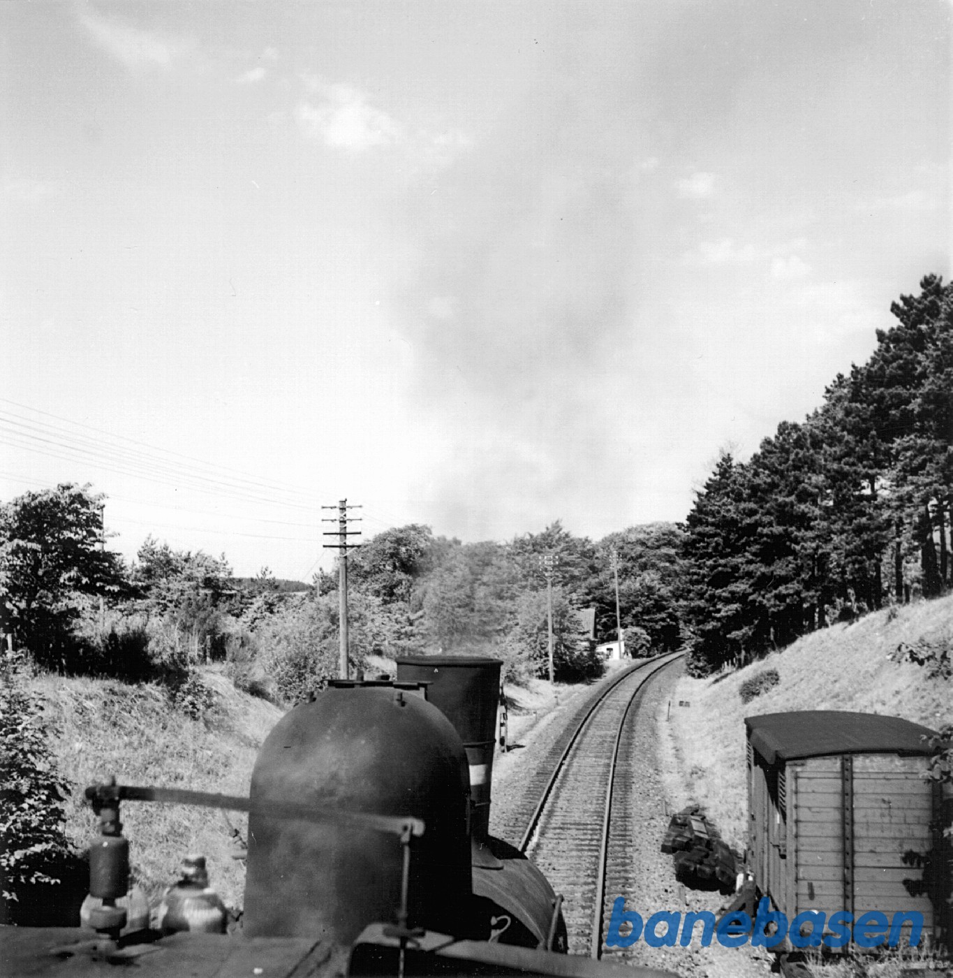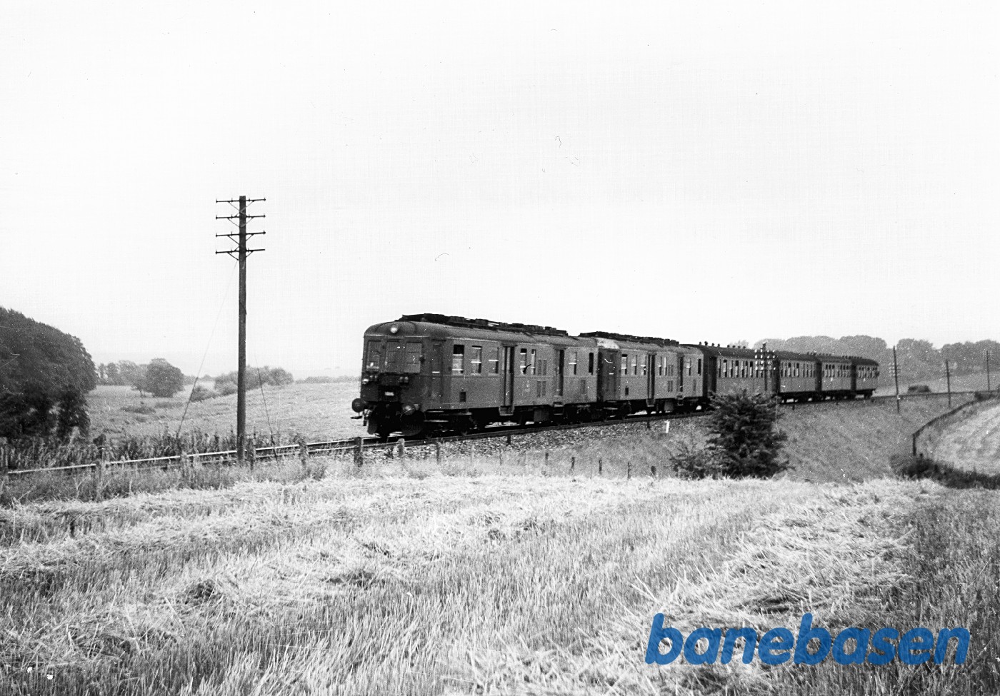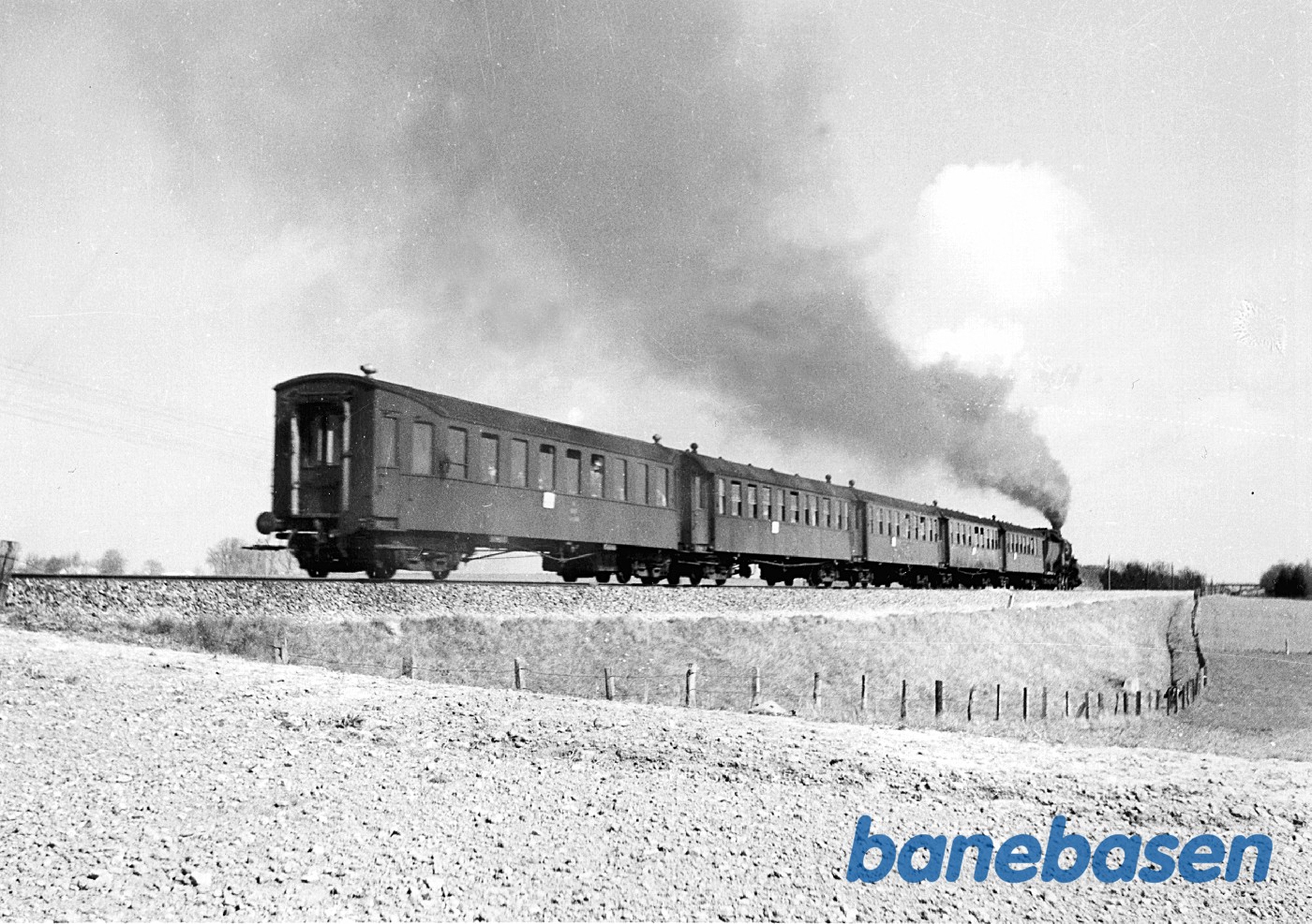 Motiv: | Tog mod Hillrød med tre toakslede DSB-vogne (CX-CV-CU) og en pakvogn kort efter afgang fra Kagerup |