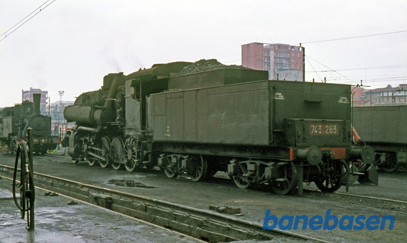 Motiv:Damplokomotiv på depotet med Franco-Crosti kedel. Læg mærke til det specielle skorstensarrangement