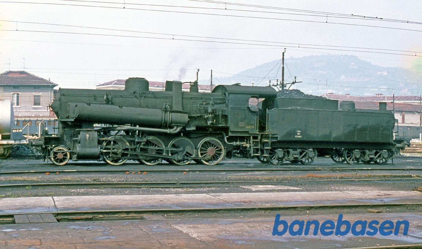 Motiv:Damplokomotiv på depotet med Franco-Crosti kedel. Læg mærke til det specielle skorstensarrangement