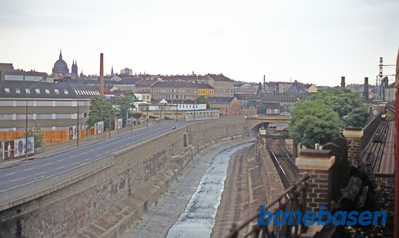 Motiv:En hovedvej langs en kanal, set fra S-toget