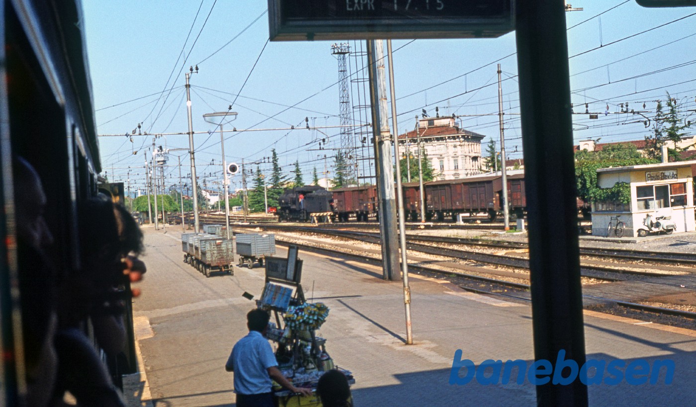 Motiv:Damplokomotiv rangerer på stationen. Vores Express til Milano afgår fra Verona kl. 17.15. Sælger på perronen