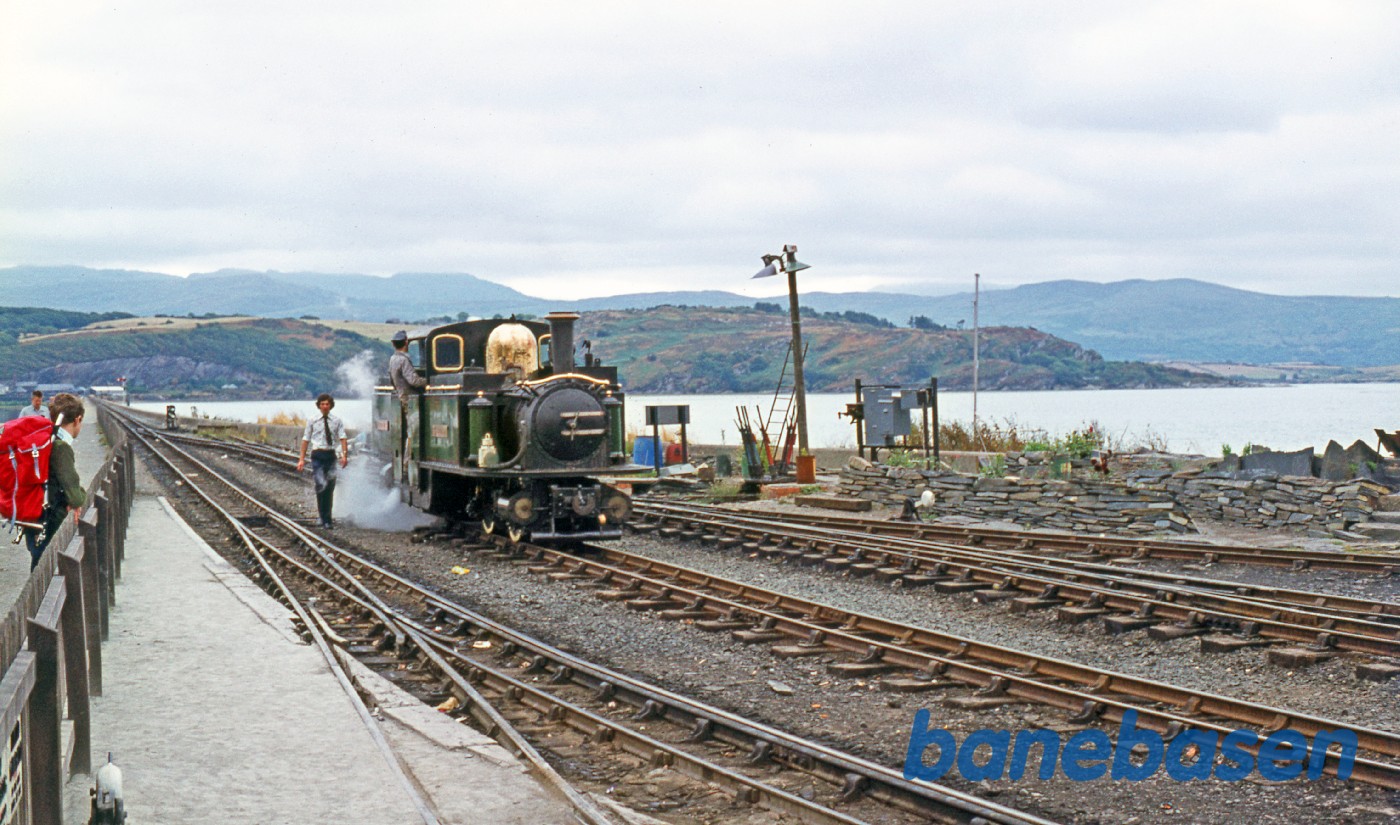 Et af de flotte damplokomotiver rangerer på stationen. Dæmningen ses til venstre