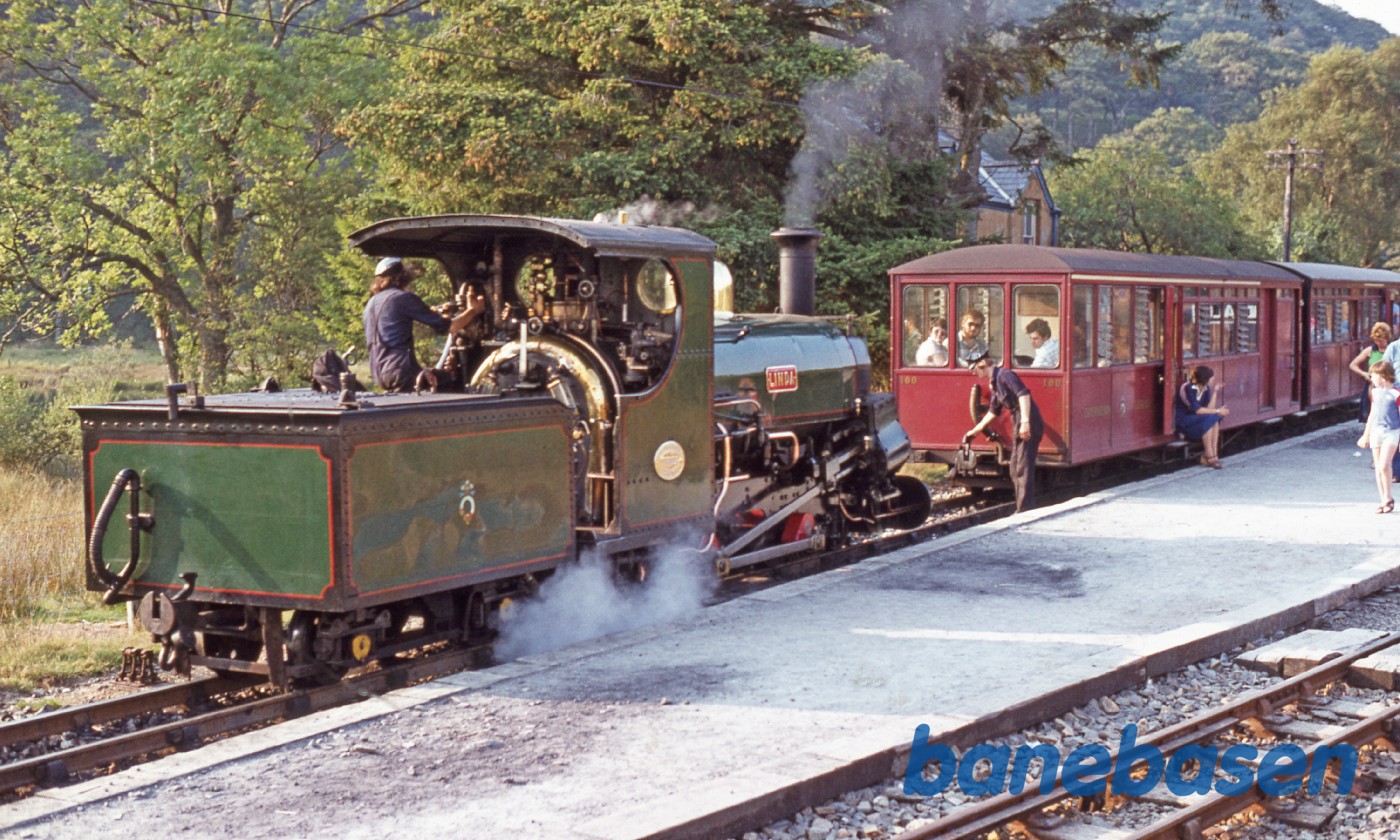 Motiv:Damplokomotivet løber om på endestationen. Banen er senere blevet genåbnet helt op til Blaenau Ffestiniog