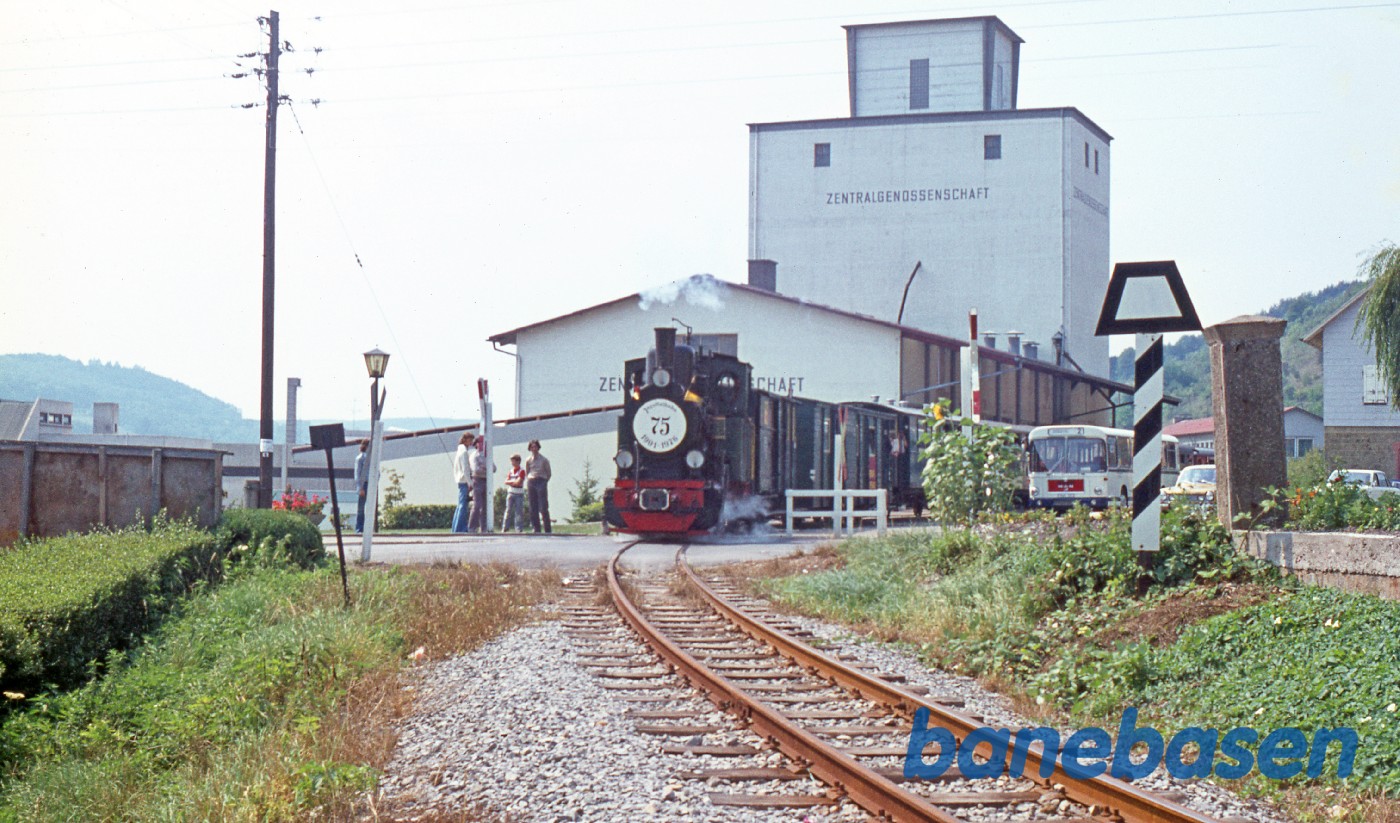Motiv:Damptoget på vej ud af stationen i retning mod Dörzbach