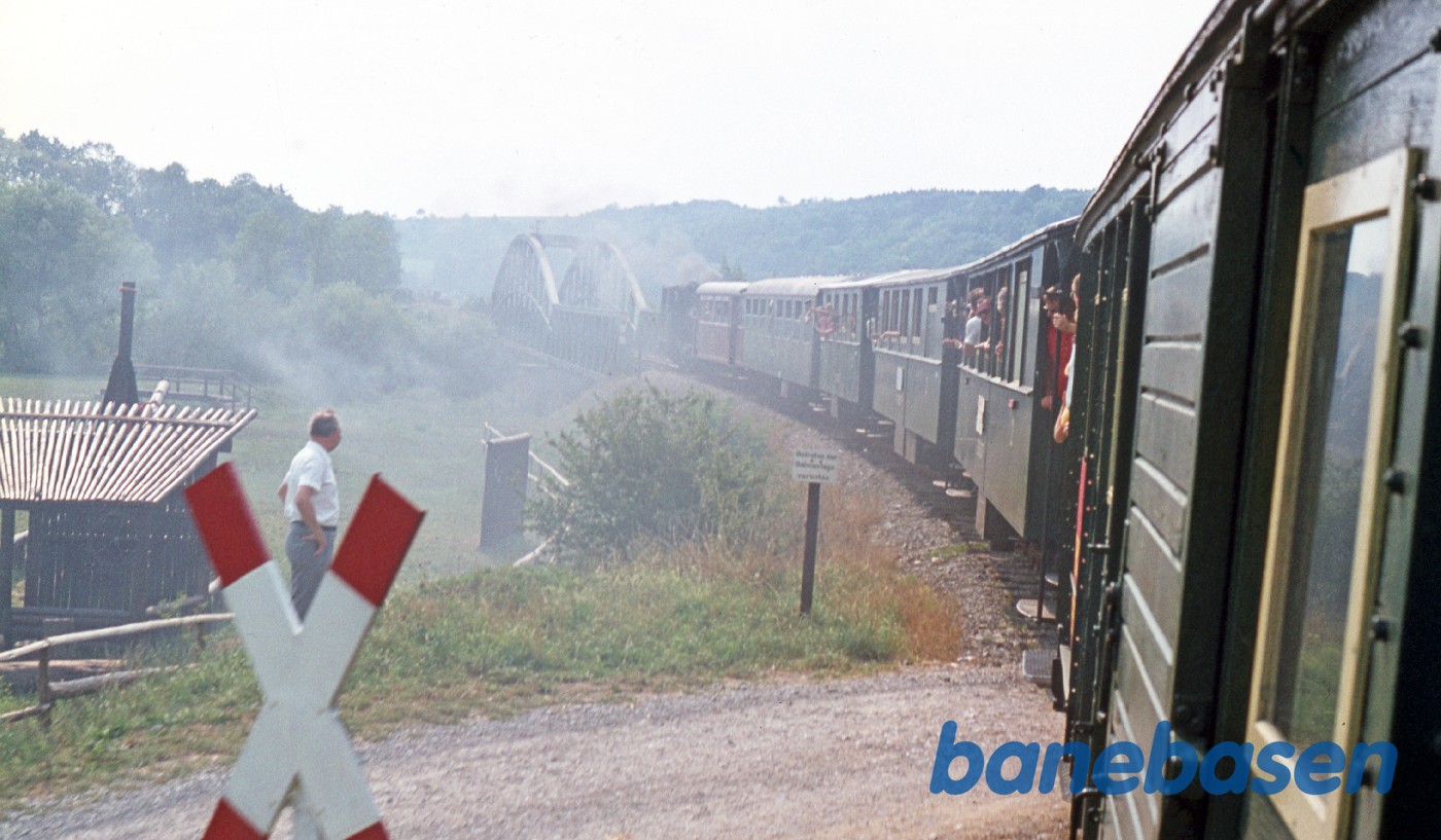 Motiv:Foto op langs toget. Toget på vej ud over broen over Jagst floden
