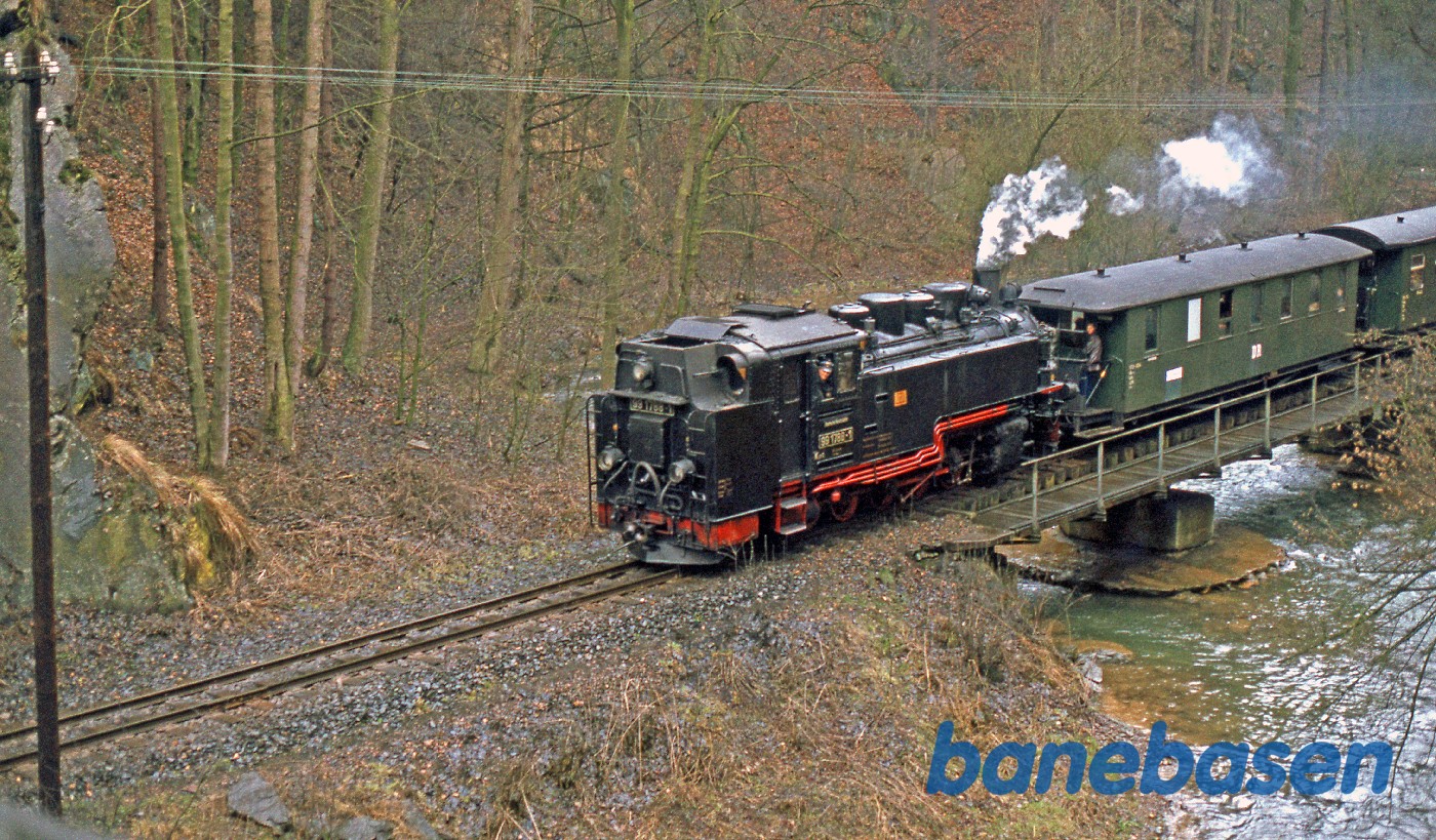 Motiv:Banen følger floden Red Weisseritz, og ved en lille bro ,kort før Rabenau, går banen tæt op ad en skovvej
