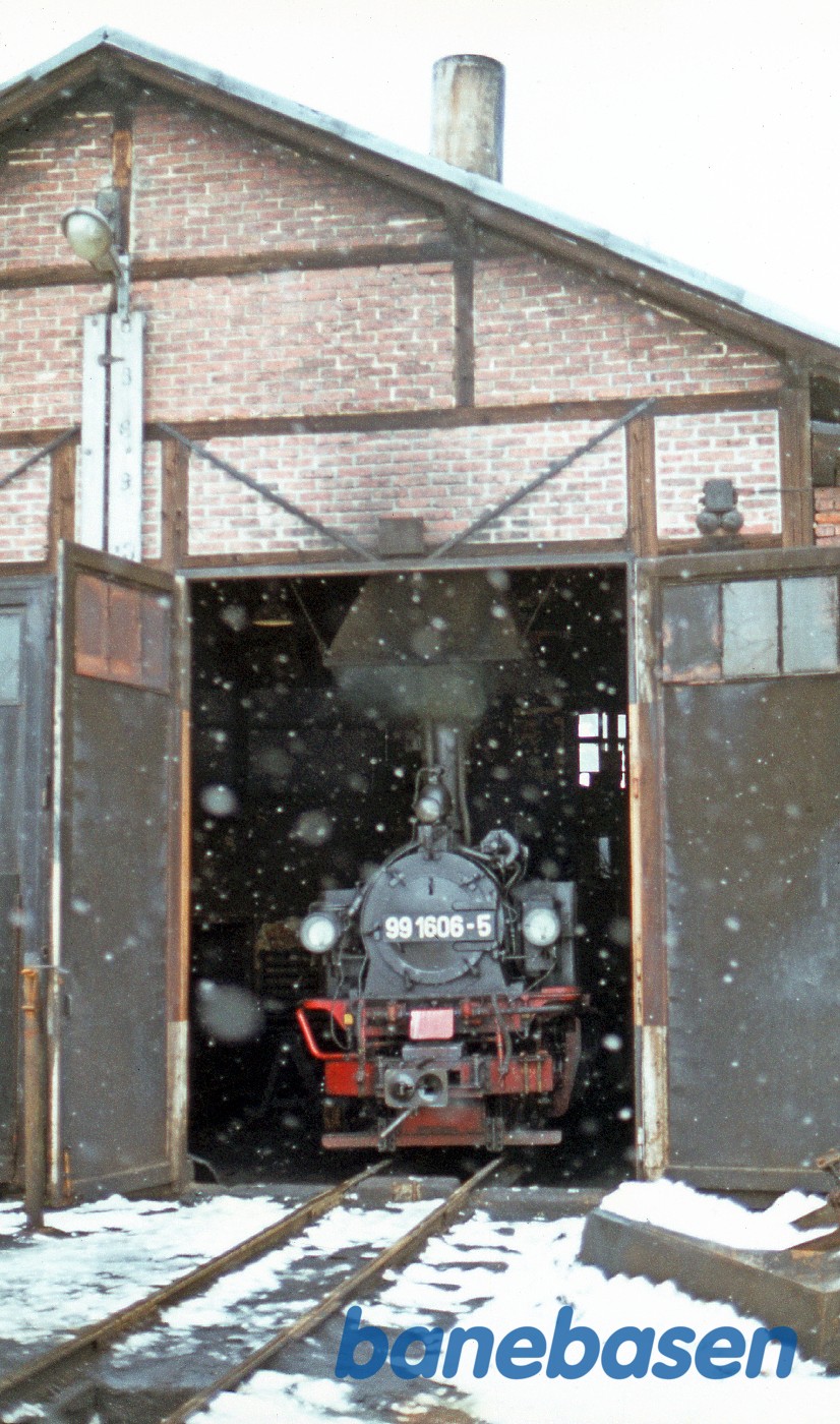 Motiv:Damplokomotivet er kørt ind i remisen på grund af snevejret