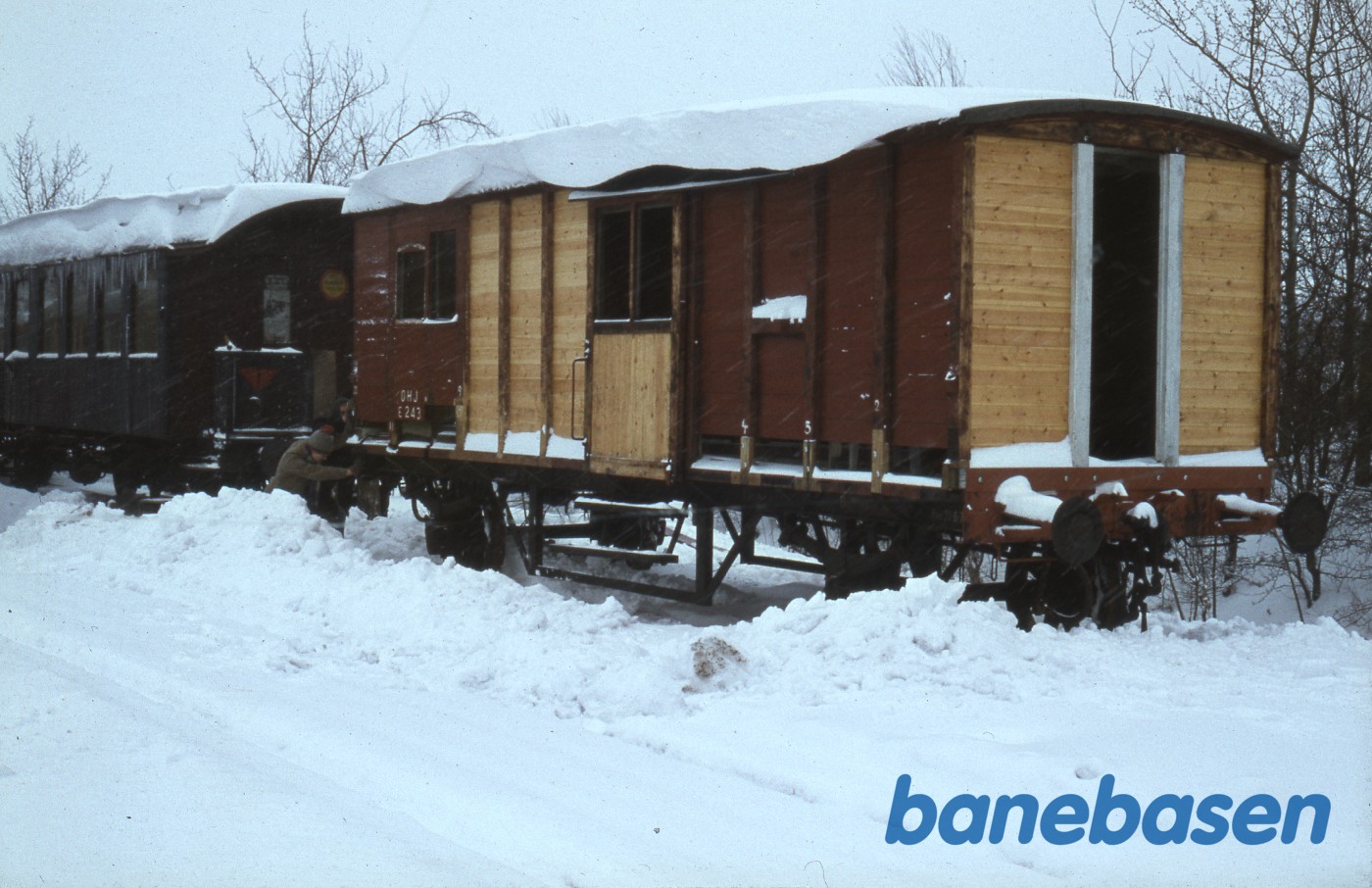 | Motiv: | Pakvognen E243 under restaurering bag Nærumbanens værksted |