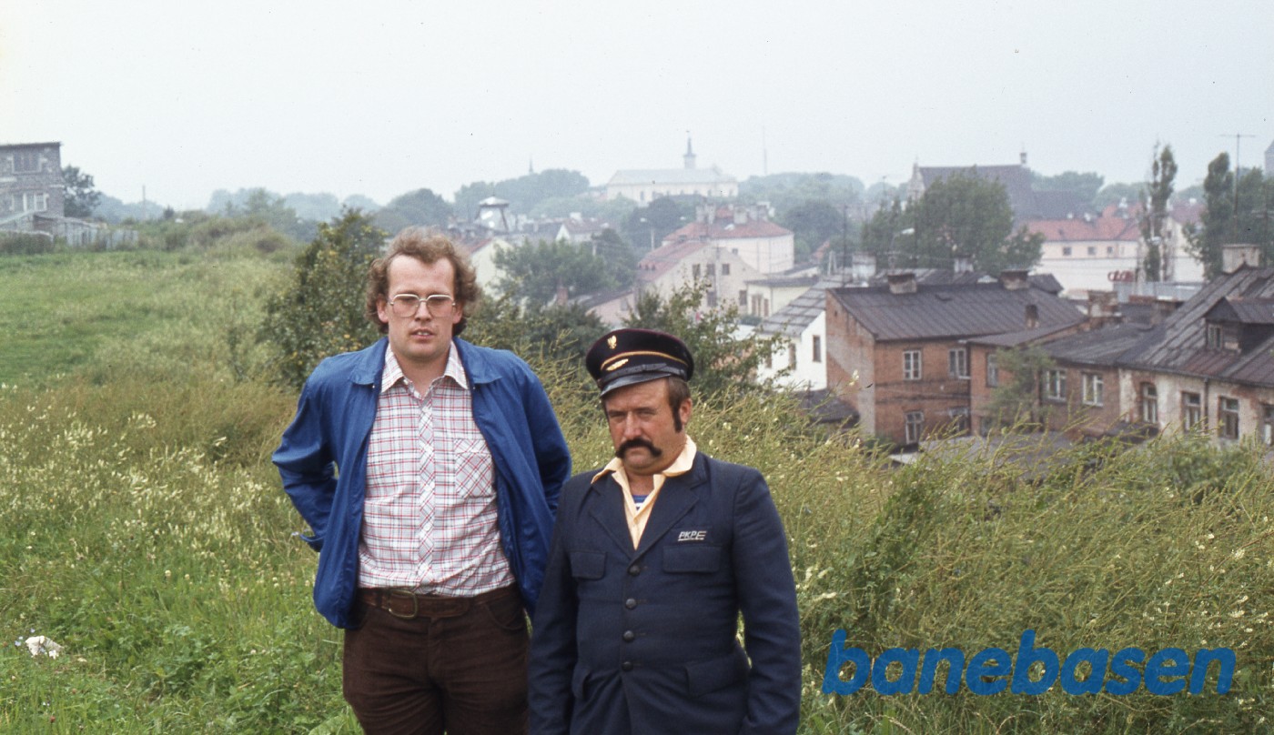 Motiv:Togføren og en jernbaneentusiast med den gamle by bagved