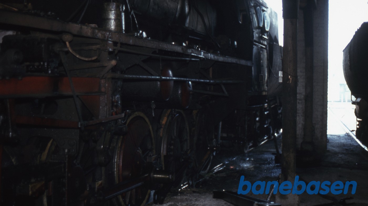 Foto af et damplokomotiv inde i mørket. Stængerne er pillet af