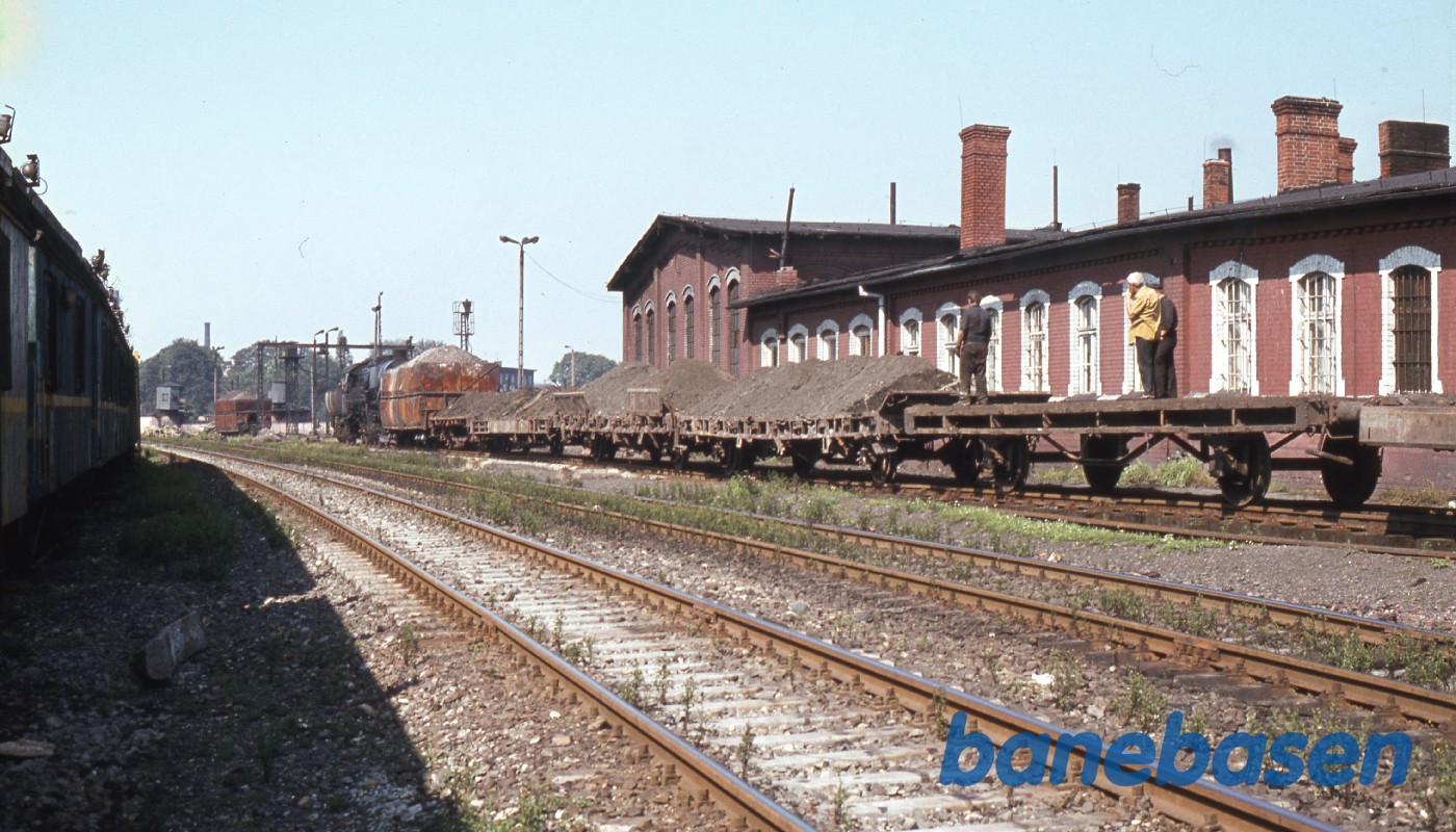 Motiv:Lokomotivet rangerer ud med et par slagge vogne