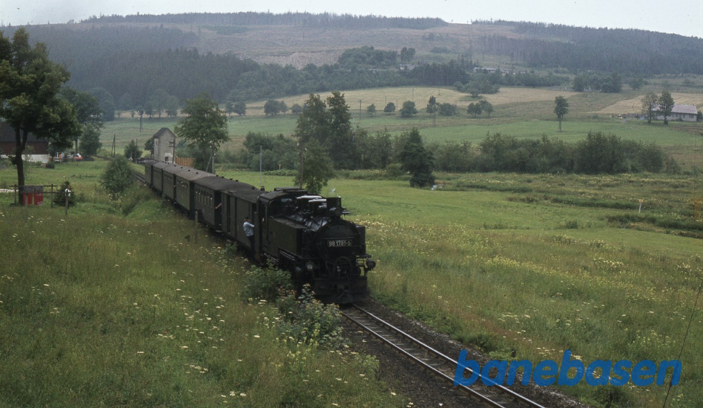 Toget på strækningen lige før stationen. Grænsepælene til Tjekkiet ses til højre