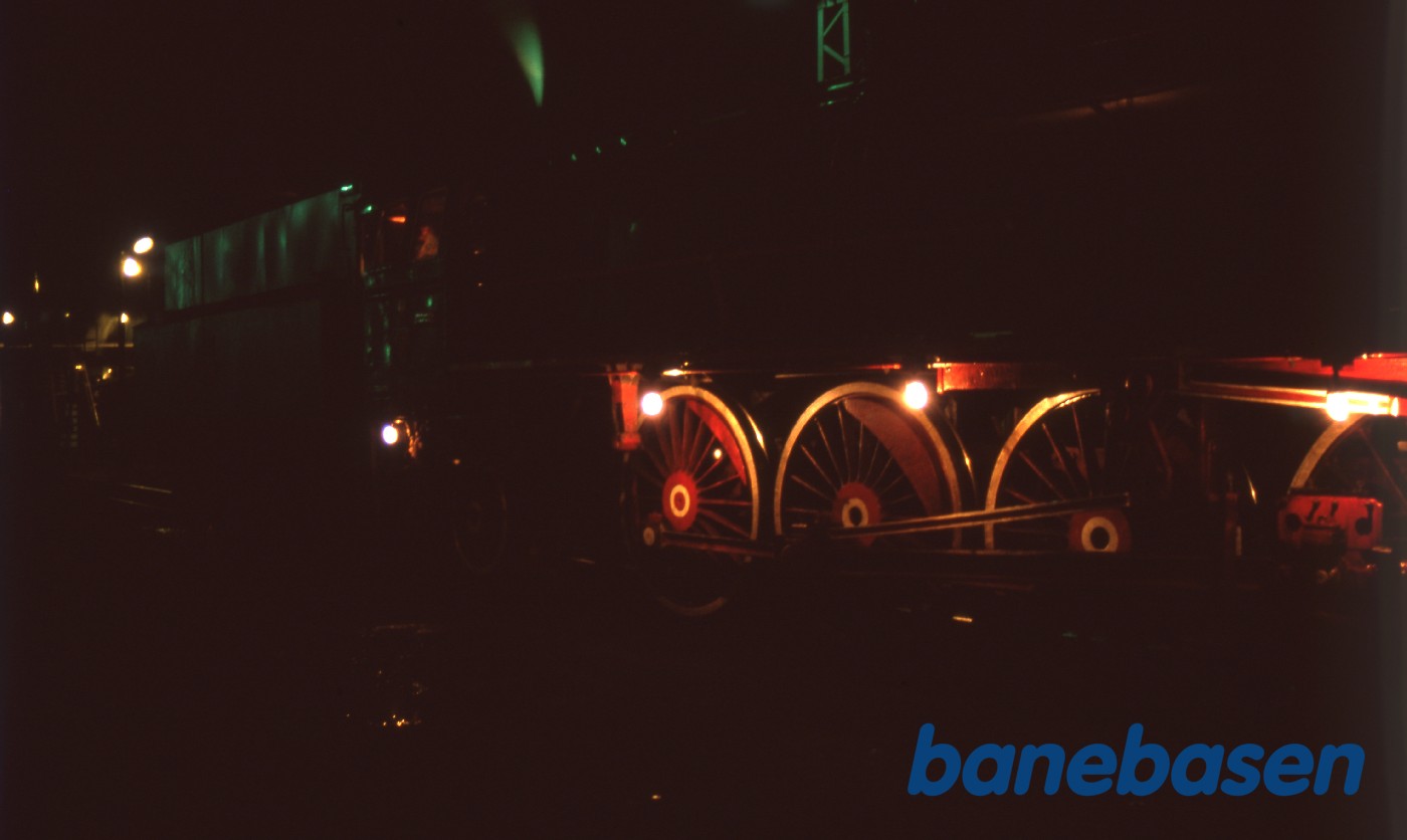 Aftenstemning i remisen. Damplokomotiv udenfor remisen med lys på gangtøjet