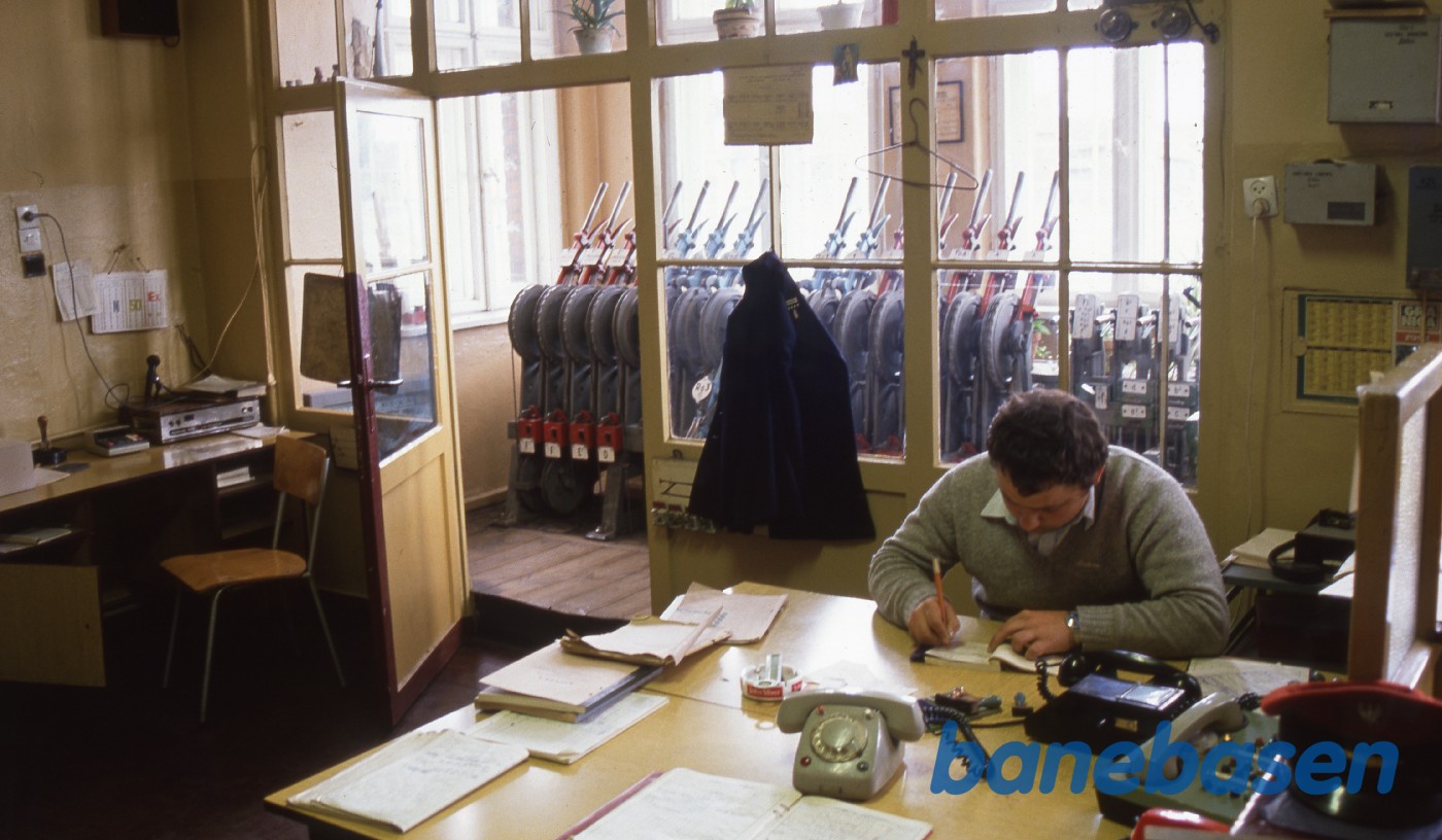 Stationsforstanderen med sikringsanlægget i baggrunden