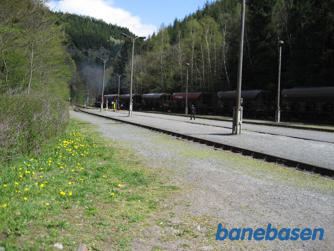Harzquerbahn. Eisfelder Thalmüle. Motorlokomotiv 199 874- 9 med godsvogne på overførselsvogn