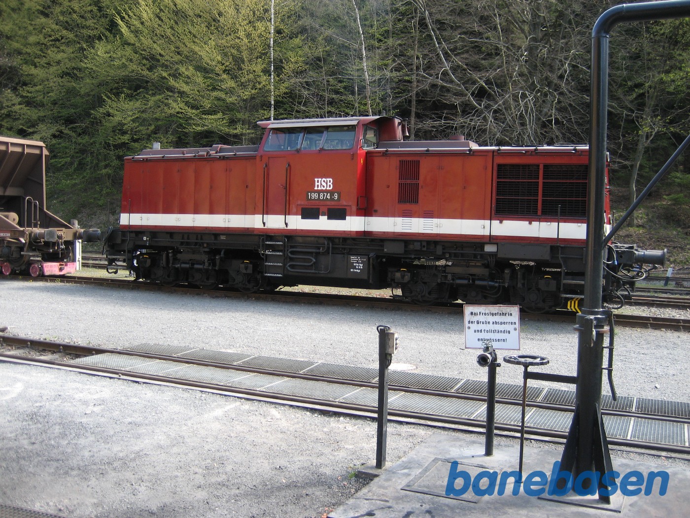 Harzquerbahn. Eisfelder Thalmüle. Motorlokomotiv 199 874- 9 med godsvogne på overførselsvogn