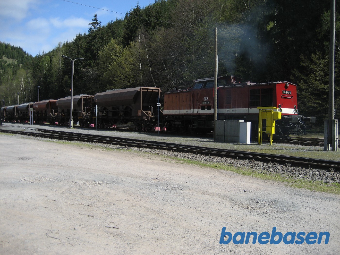 Harzquerbahn. Eisfelder Thalmüle. Motorlokomotiv 199 874- 9 med godsvogne på overførselsvogn