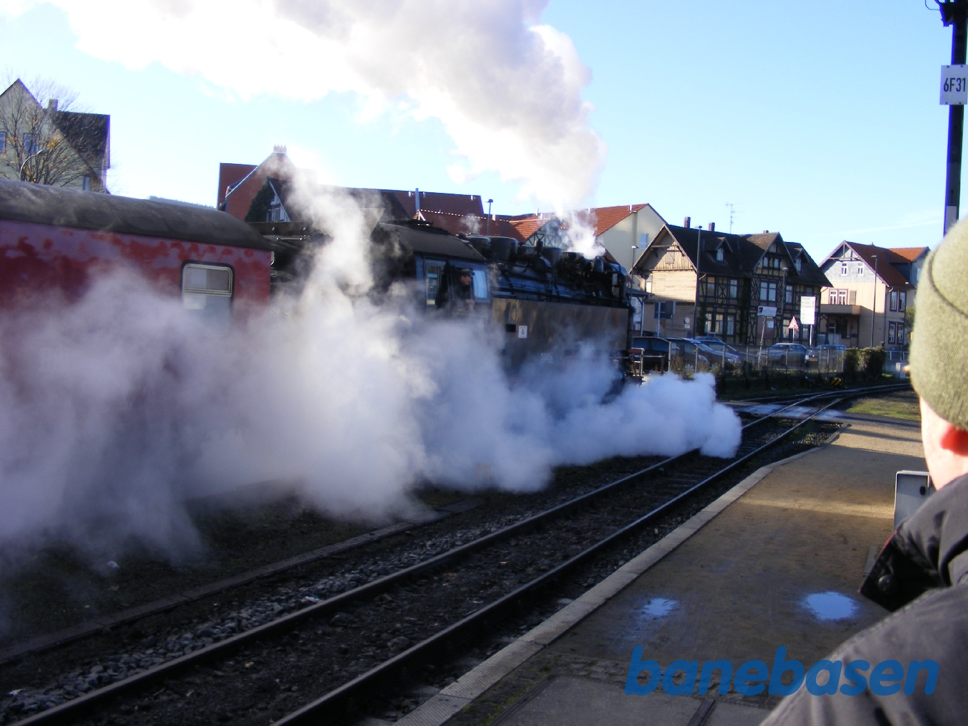 Motiv:Damplokomotiver med stort tog afgår fra Wernigerode station
