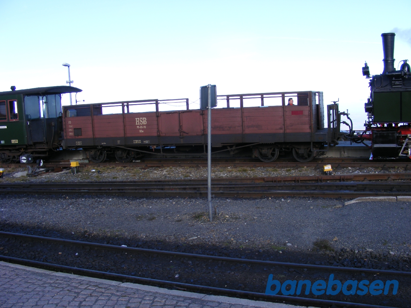 Damplokomotiv 99 5902 med tog på Brocken station. Åben godsvogn til persontransport
