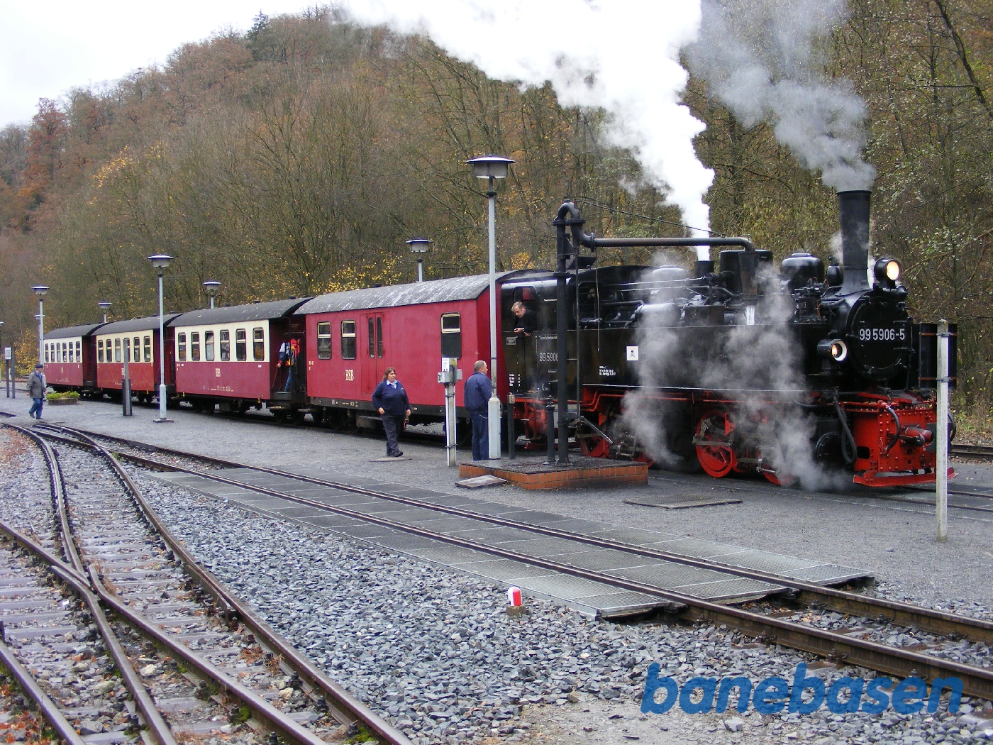 Damplokomotiv 99 5906-5 med tog på Alexibad station