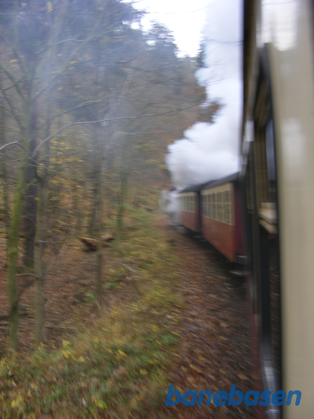 Damplokomotiv 99 5906-5 med tog. Bjergsiderne mellem Alexibad og Harzgerode