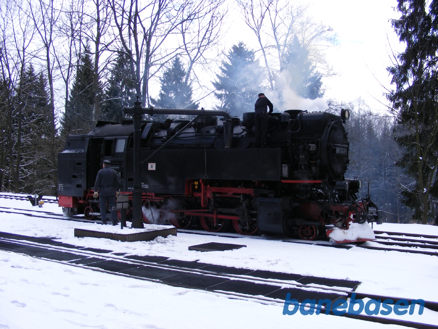 Motiv:Damplokomotiv 99 7243-1. Vandtagning på Brocken station