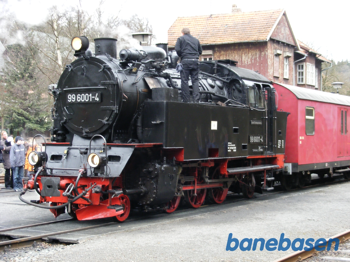 Damplokomotiv 99 6001-4 på Alexibad station. Person står på vandkassen