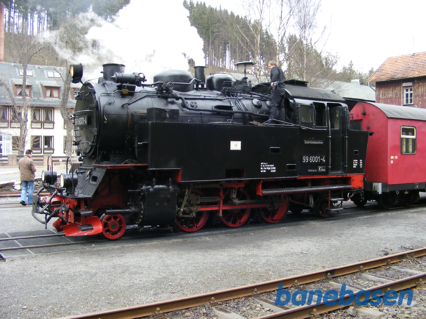 Damplokomotiv 99 6001-4 på Alexibad station. Person står på vandkassen