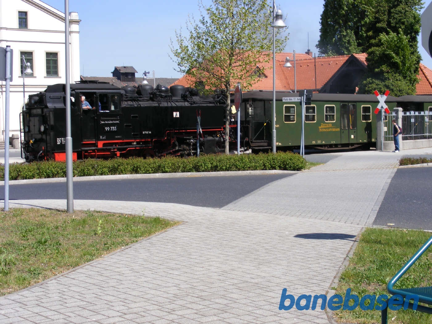 Motiv:Zittau Station. Damplokomotiv 99 735 med tog ankommer